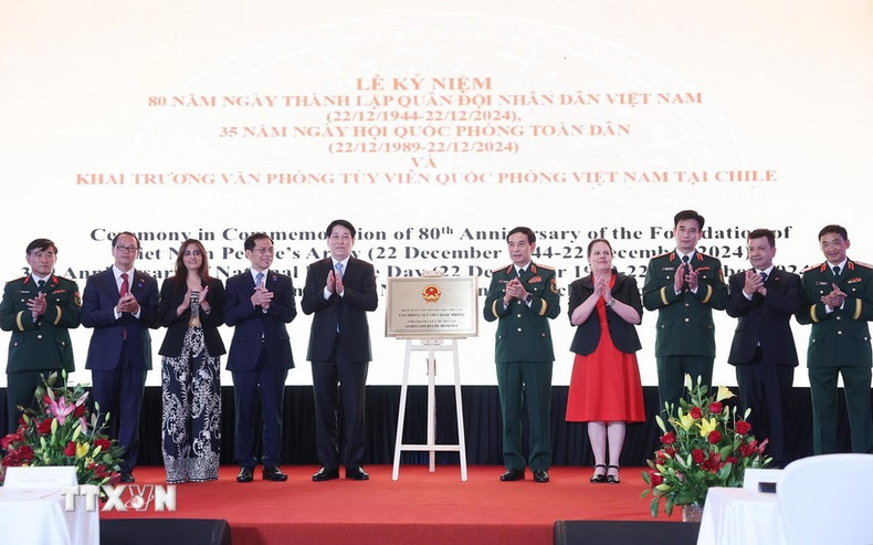 | El presidente Luong Cuong y el ministro de Defensa de Vietnam, Phan Van Giang, inauguran la Agregaduría de Defensa de Vietnam en Chile. |