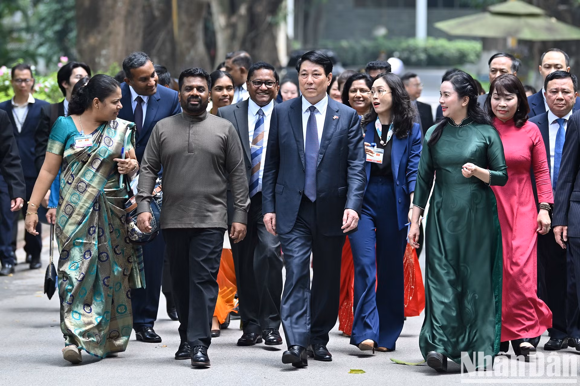 | El Presidente de Vietnam, Luong Cuong, entrega la insignia del Presidente Ho Chi Minh a su par esrilanqués, Anura Kumara Dissanayaka. |