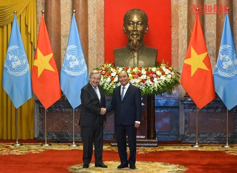 | Panorama de la reunión bilateral efectuada posteriormente en el Palacio Presidencial, en Hanói. |