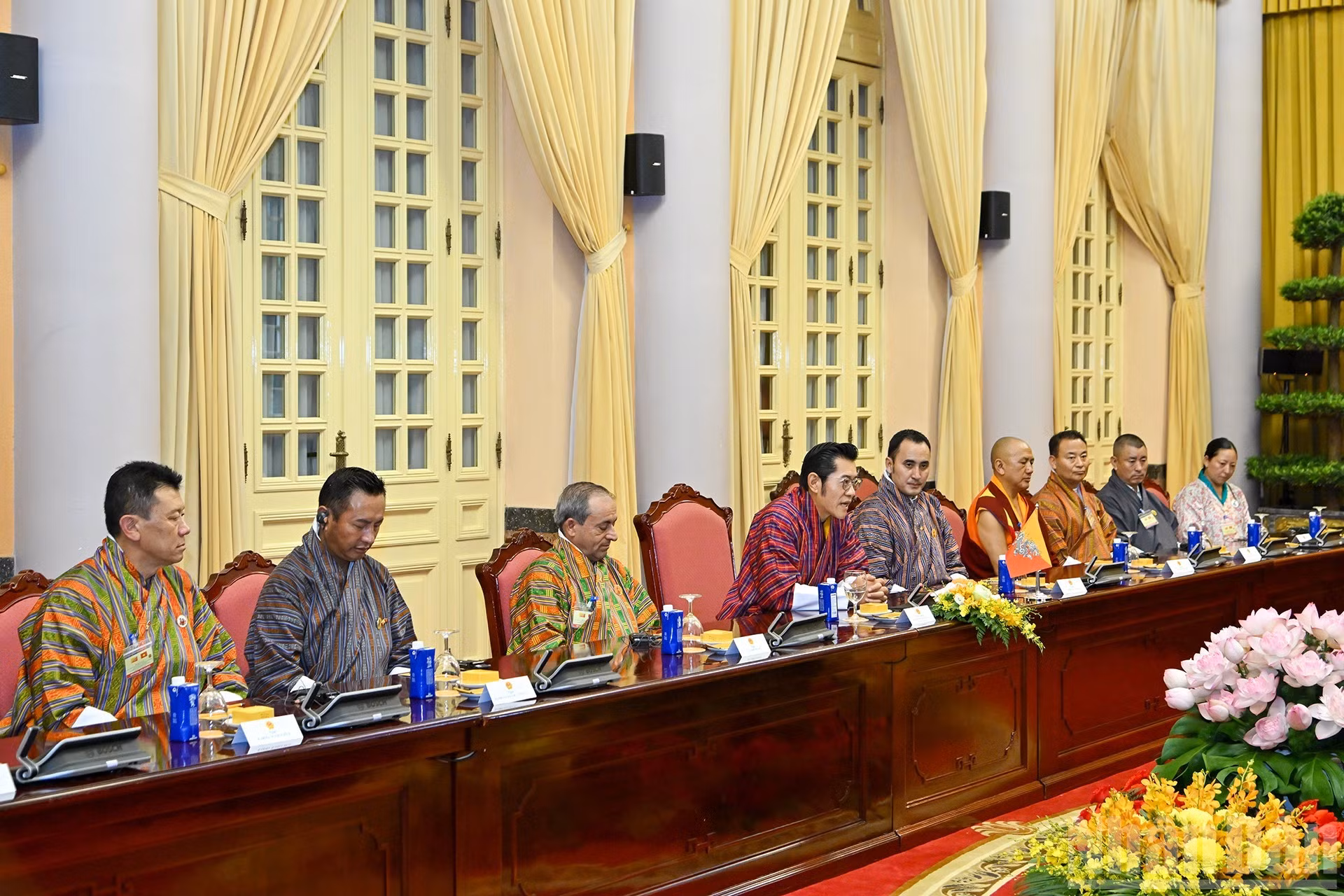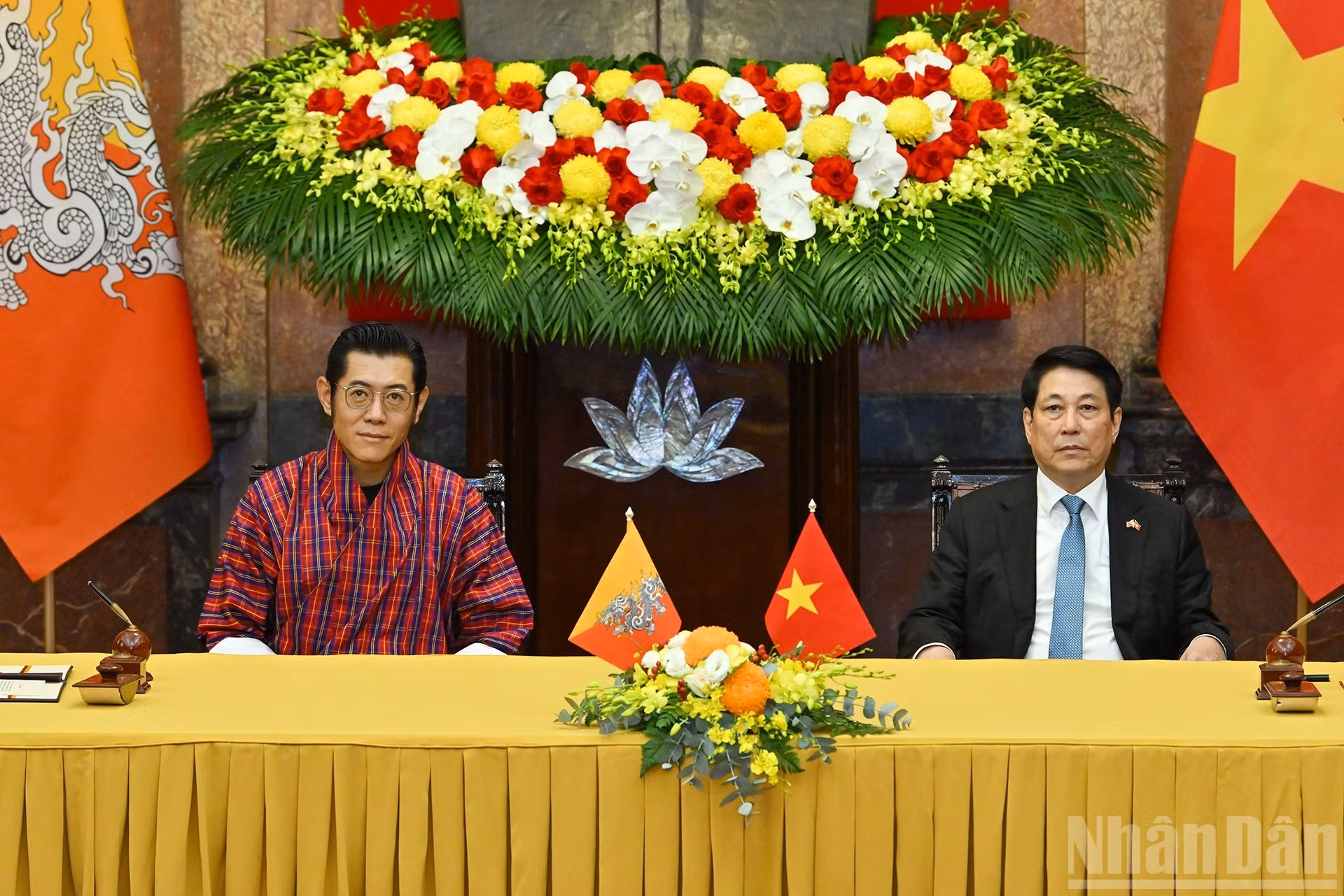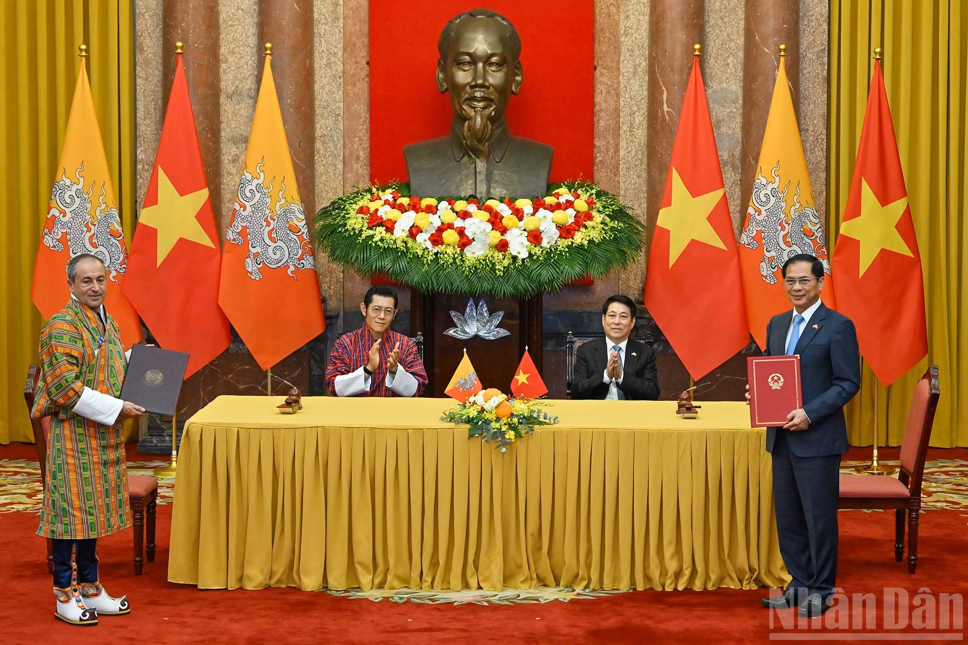 Tras las conversaciones, el presidente vietnamita, Luong Cuong, y el rey de Bután, Jigme Khesar Namgyel Wangchuck, presencian la ceremonia de intercambio de firmas de documentos de cooperación entre ambos países en diversas áreas.