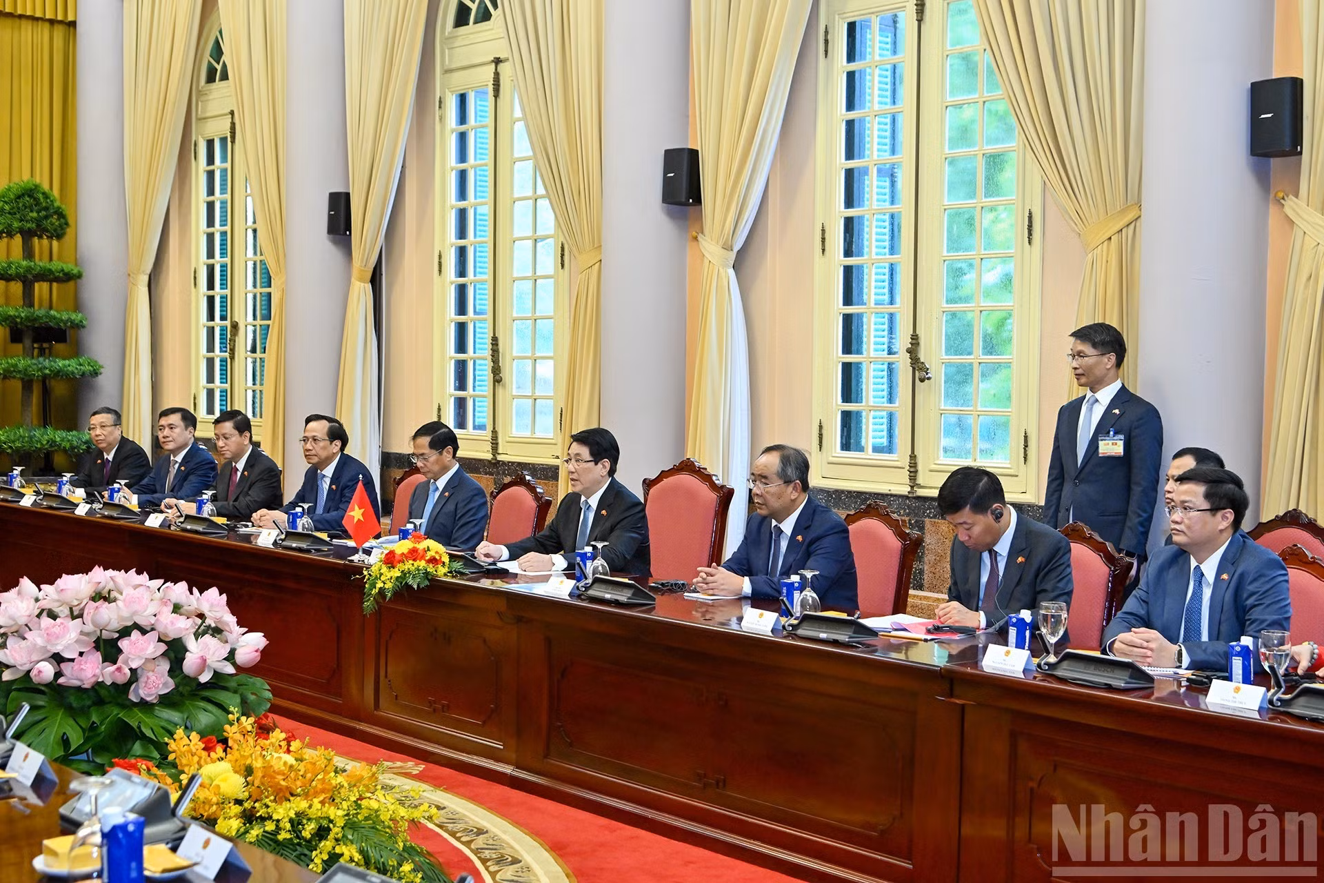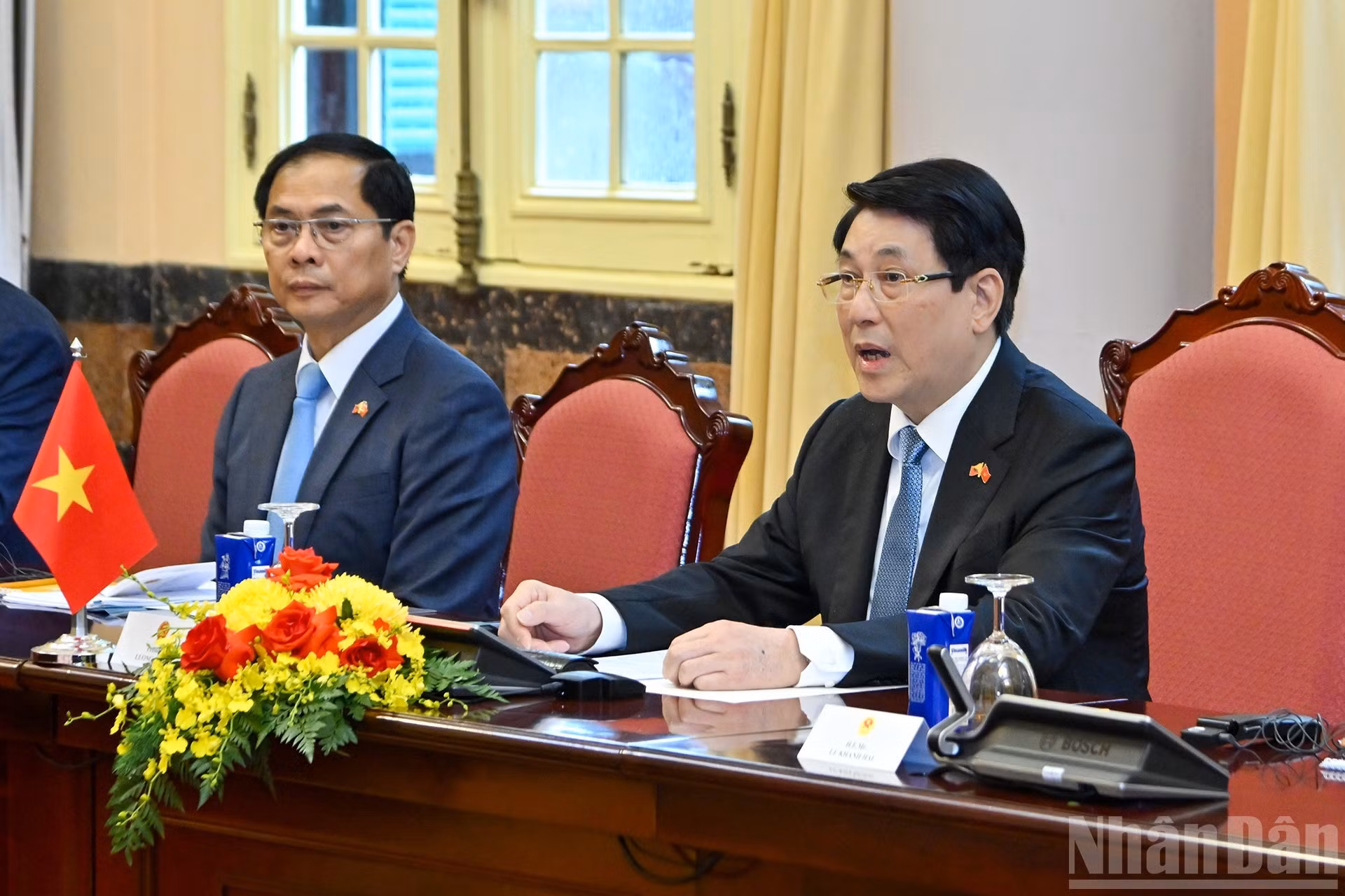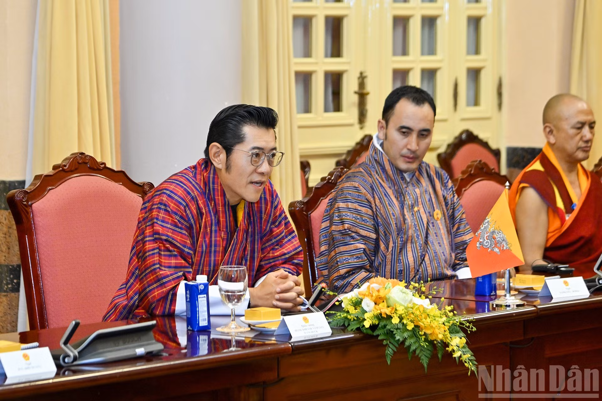 Tras las conversaciones, el presidente vietnamita, Luong Cuong, y el rey de Bután, Jigme Khesar Namgyel Wangchuck, presencian la ceremonia de intercambio de firmas de documentos de cooperación entre ambos países en diversas áreas.