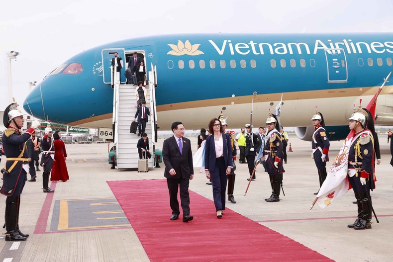 | La ceremonia de bienvenida al presidente de la Asamblea Nacional de Vietnam, Vuong Dinh Hue, en el aeropuerto de Ezeiza en Buenos Aires. |