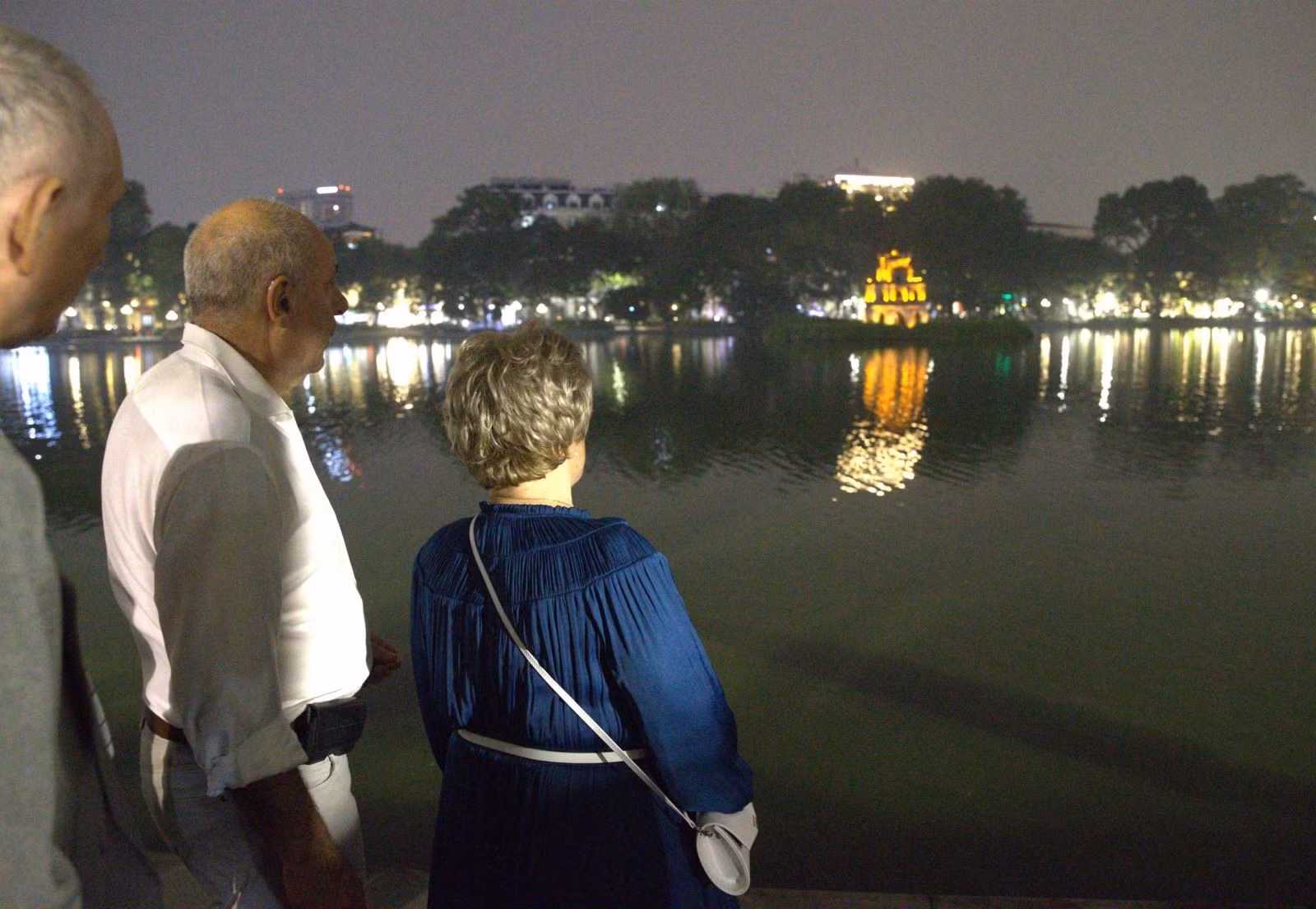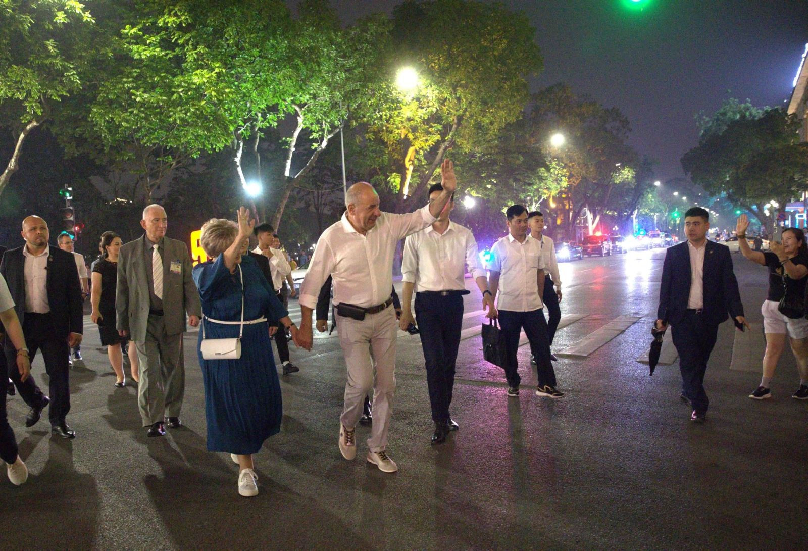 | El presidente húngaro, Sulyok Tamás, y su esposa recorren por las calles que rodean el lago Hoan Kiem |