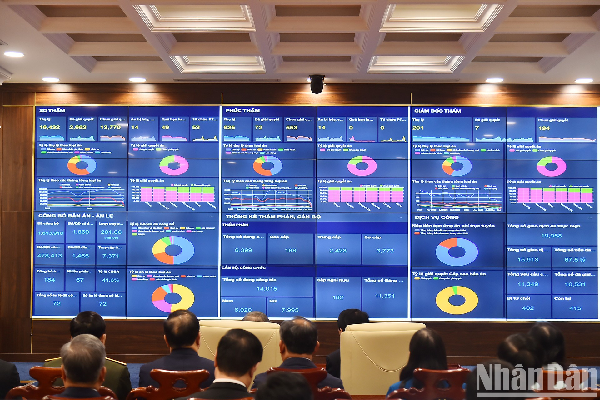 | Luong Cuong y otros delegados visitan el Centro de Supervisión y Funcionamiento del Tribunal Popular Supremo. |