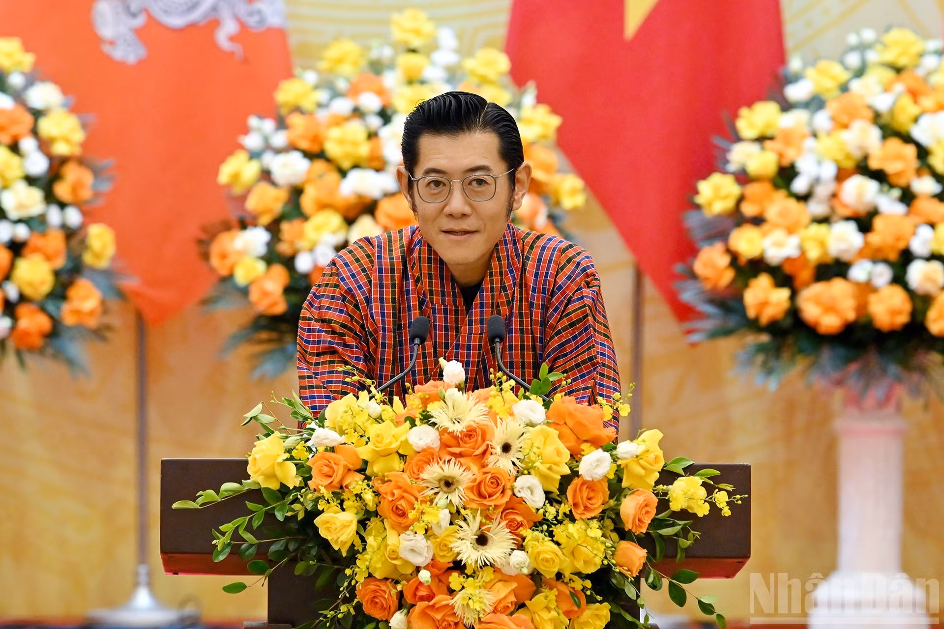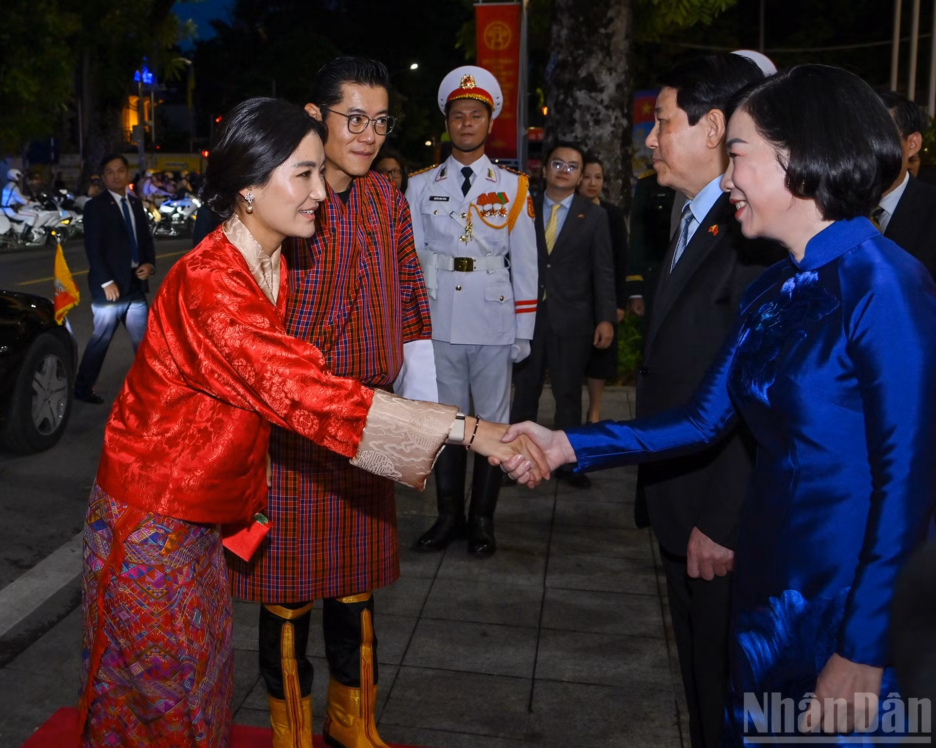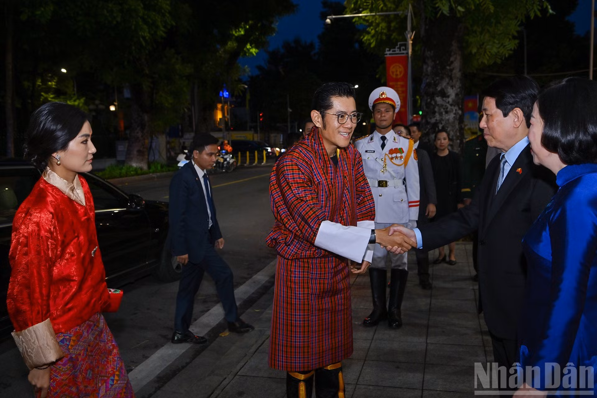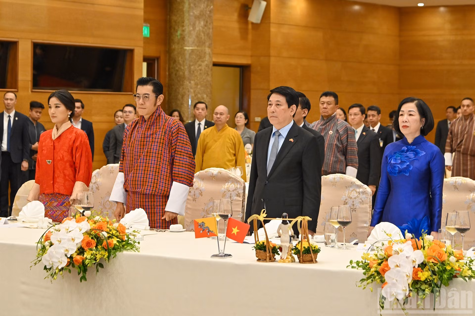 El presidente vietnamita, Luong Cuong, y su esposa, Nguyen Thi Minh Nguyet, junto con el rey de Bután, Jigme Khesar Namgyel Wangchuck, la reina Jetsun Pema, y los delegados escuchan a la banda militar interpretar los himnos nacionales de ambos países.