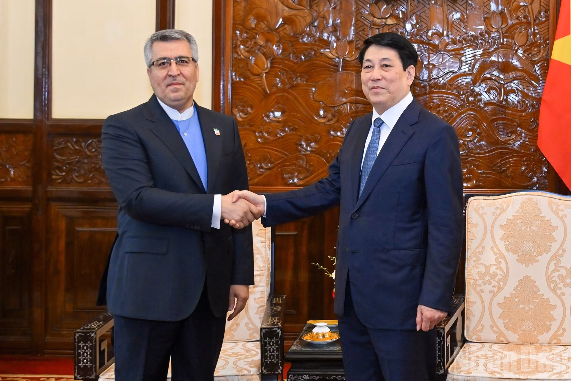 Vista de la reunión.El presidente Luong Cuong recibe al embajador iraní, Ali Akbar Nazari.