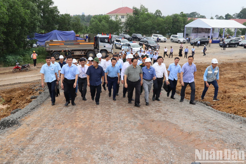 | El primer ministro Pham Minh Chinh y la delegación que lo acompaña inspeccionan el proyecto de la autopista Bien Hoa - Vung Tau, en el tramo de la comuna de An Phuoc, distrito de Long Thanh, en Dong Nai. |