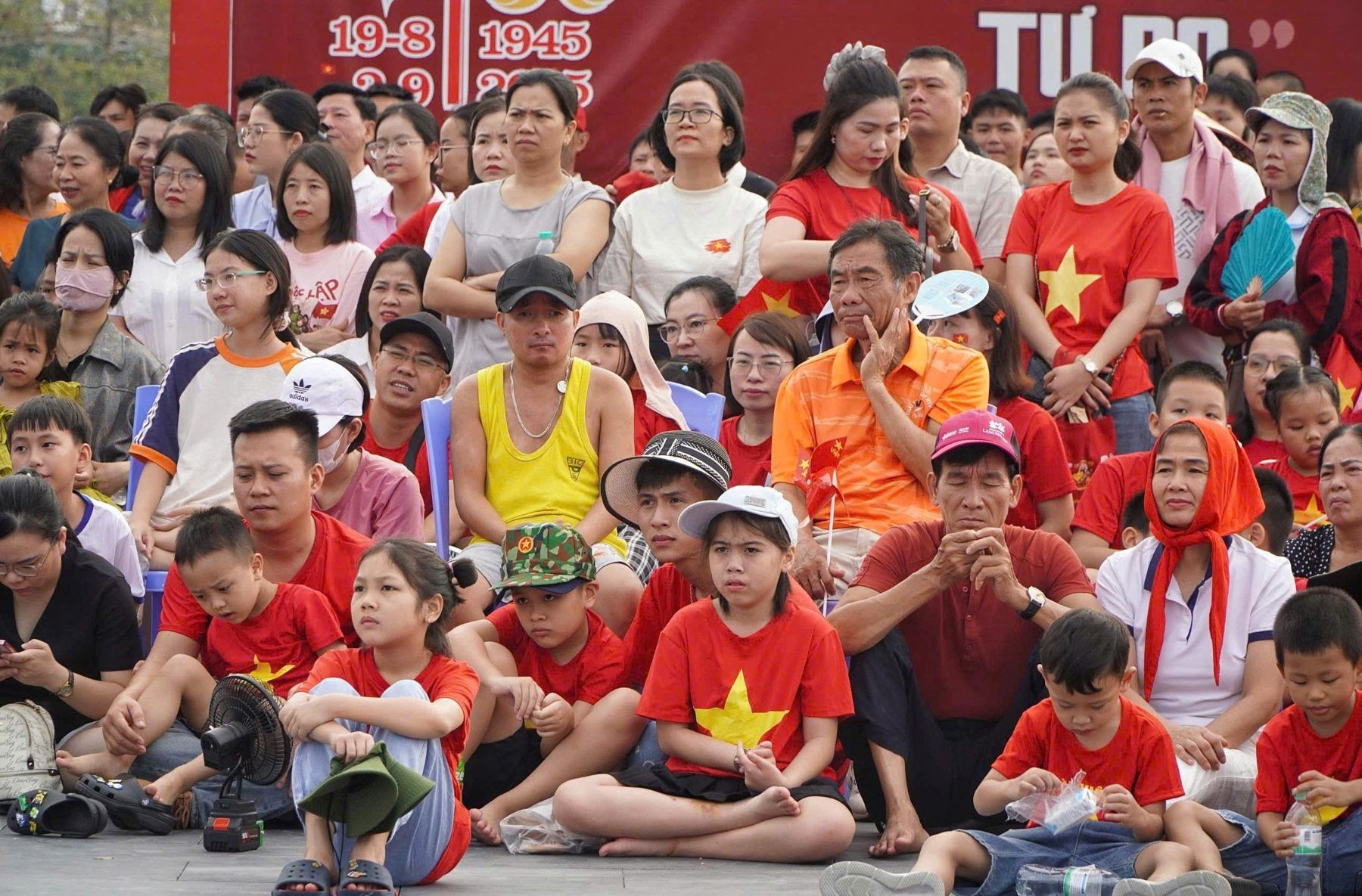 La gente se congrega para seguir en directo el desfile conmemorativo del 80º aniversario del Día Nacional, organizado en Hanói, a través de una pantalla LED de gran tamaño instalada en el recinto de la plaza.