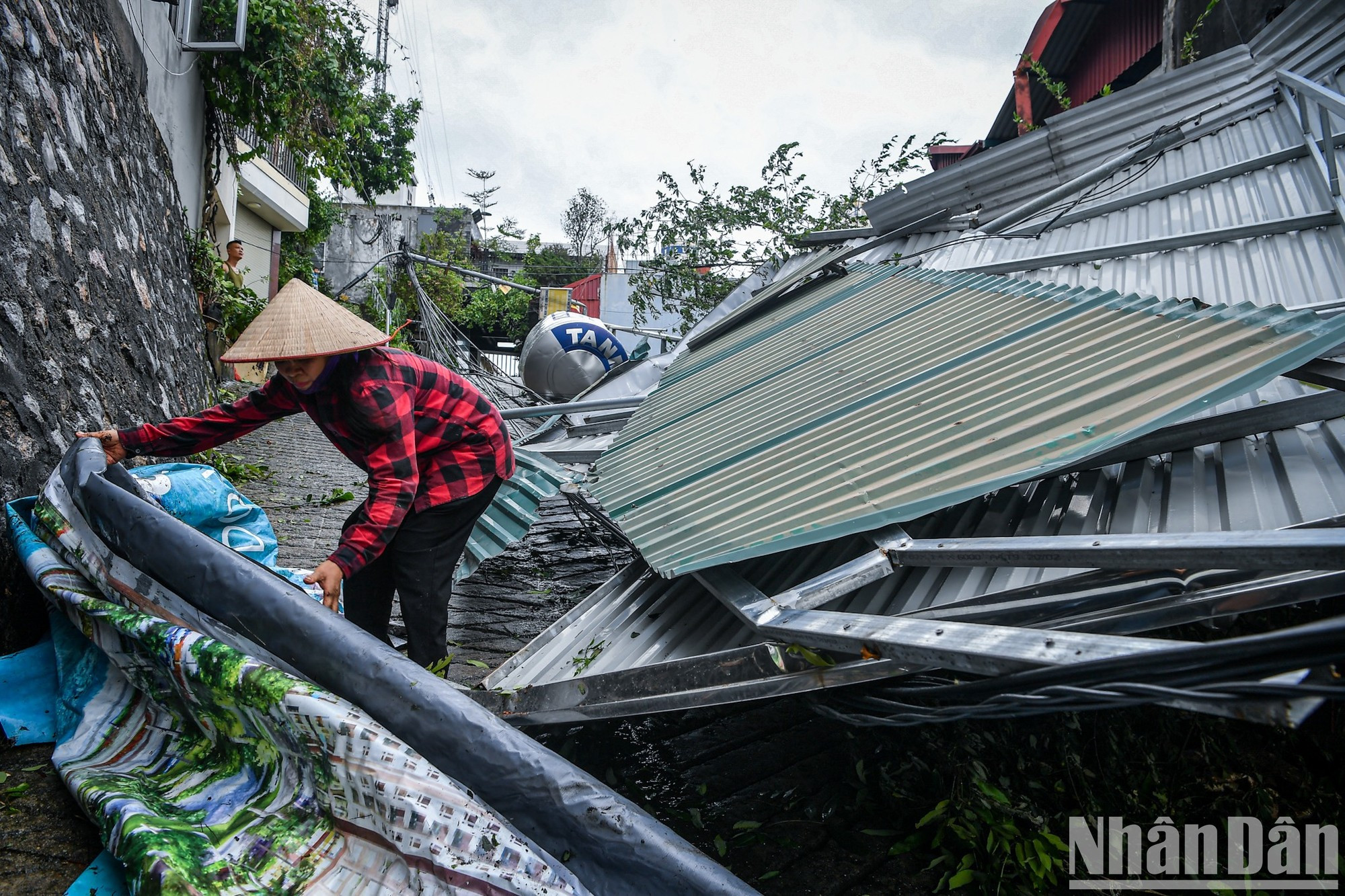 | Un residente del distrito de Hong Hai, cuyo tejado se voló durante la noche de la supertormenta, limpia la casa. |