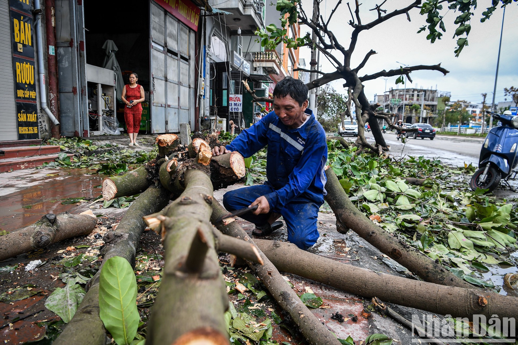 | Tras la tormenta, los residentes de Ha Long retiraron urgentemente los árboles caídos de las calles. |
