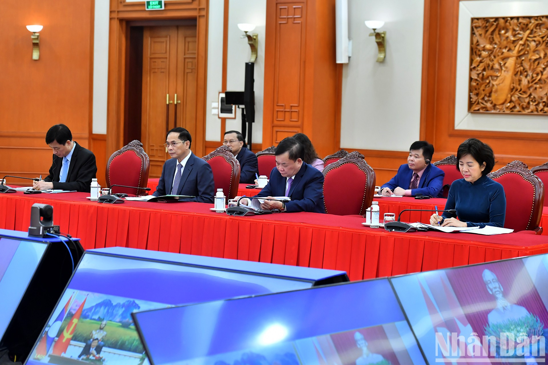 | El secretario general del PCV, To Lam, sostiene una llamada telefónica con el secretario general del PPRL y presidente de Laos, Thongloun Sisoulith. |