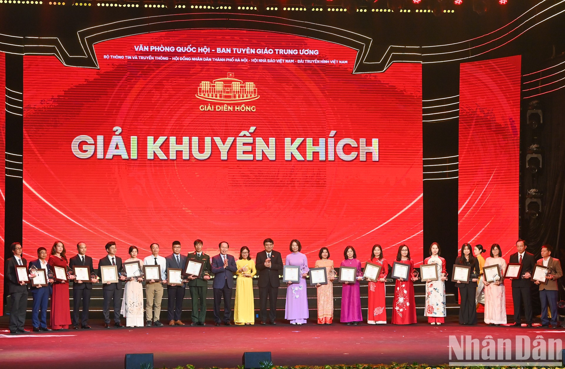 | Le Quoc Minh, subjefe de la Comisión de Comunicación y Educación del Comité Central del Partido Comunista de Vietnam, presidente-editor del periódico Nhan Dan y titular de la Asociación de Periodistas del país y el ministro de Información y Comunicación, Nguyen Manh Hung, otorgan premios C a los autores. |