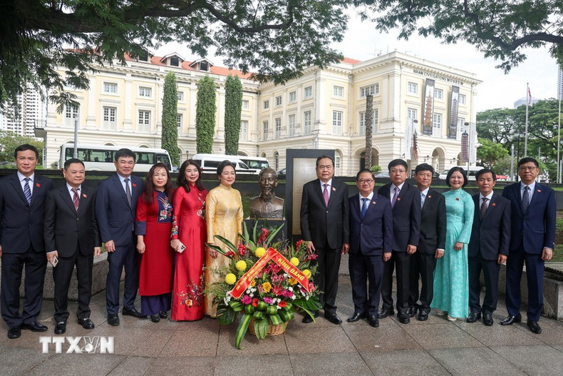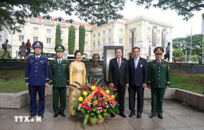 | El presidente de la Asamblea Nacional Tran Thanh Man, su esposa y la delegación vietnamita ofrecen flores en memoria del Presidente Ho Chi Minh. |