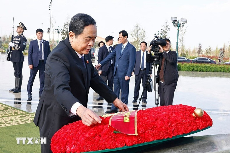 | El presidente de la Asamblea Nacional de Vietnam, Tran Thanh Man, y su esposa depositan una corona de flores en el Monumento a la Independencia. |