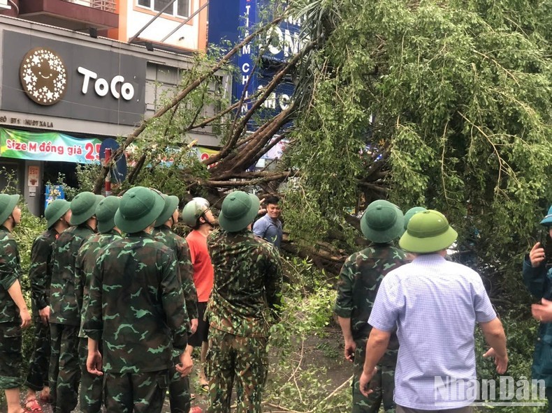 | En la tarde del 7 de septiembre, la policía de Vinh Phuc moviliza fuerzas de rescate para superar las consecuencias de la caída de árboles y despejar las carreteras. (Foto Ha Hong Ha) |