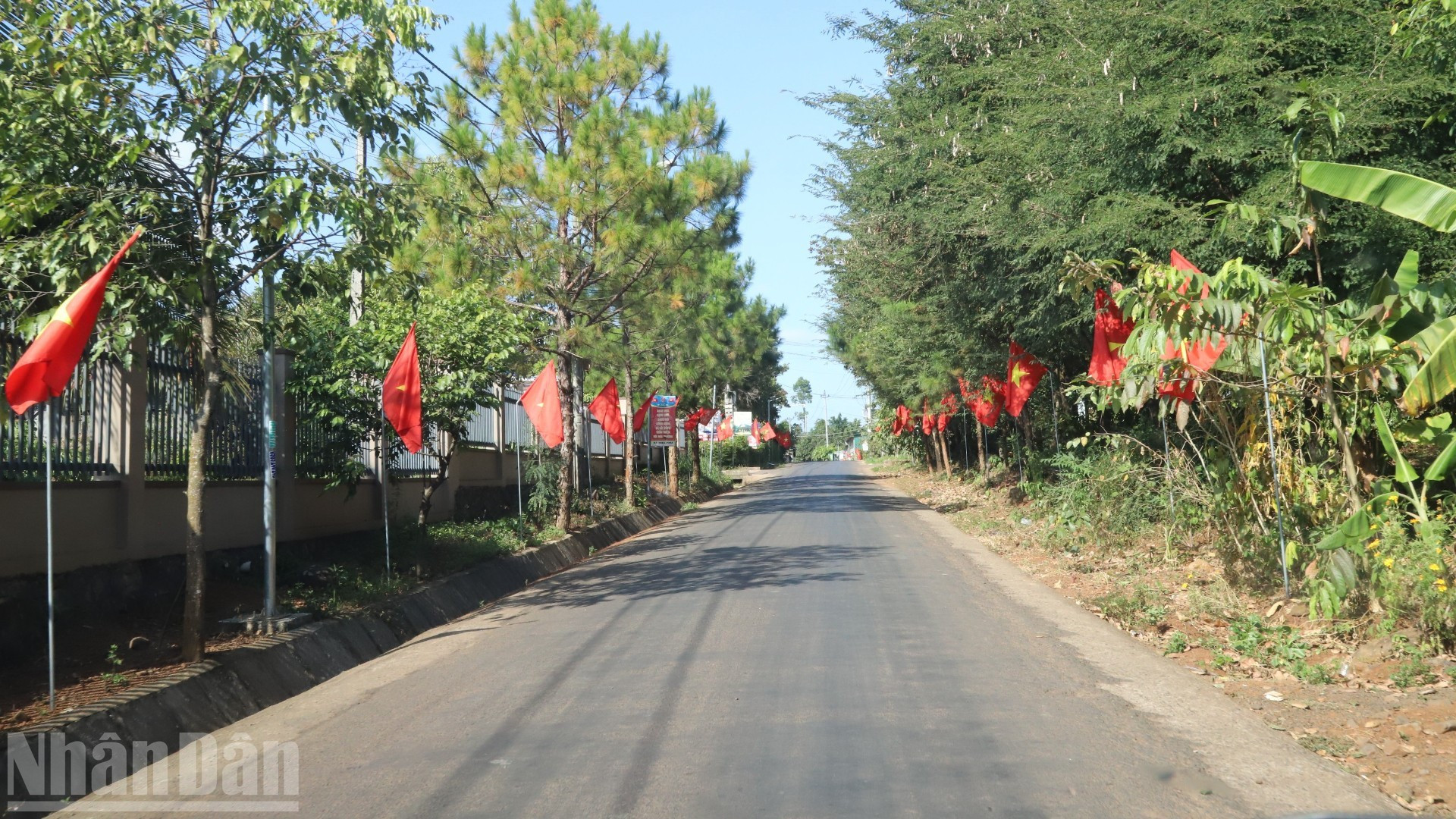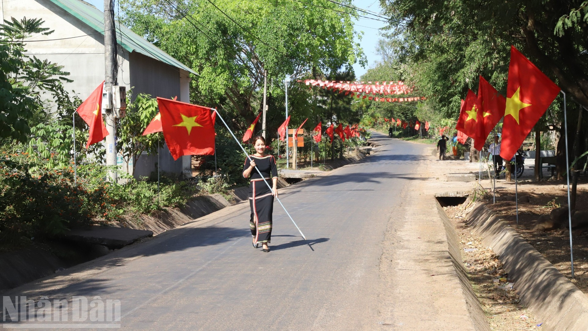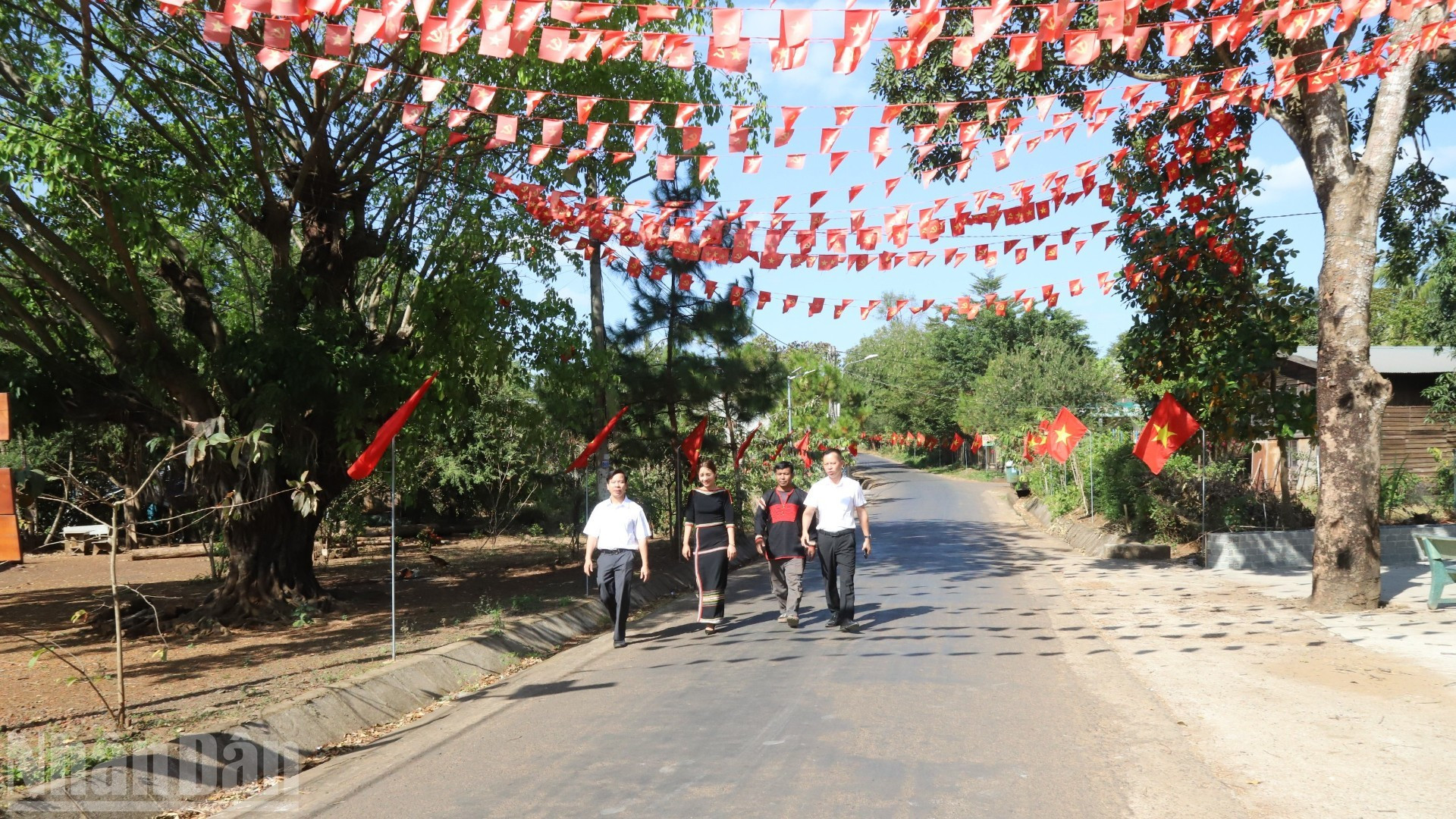 Un camino que conduce a una aldea de minorías étnicas en Dak Lak se ve cubierto de banderas nacionales.