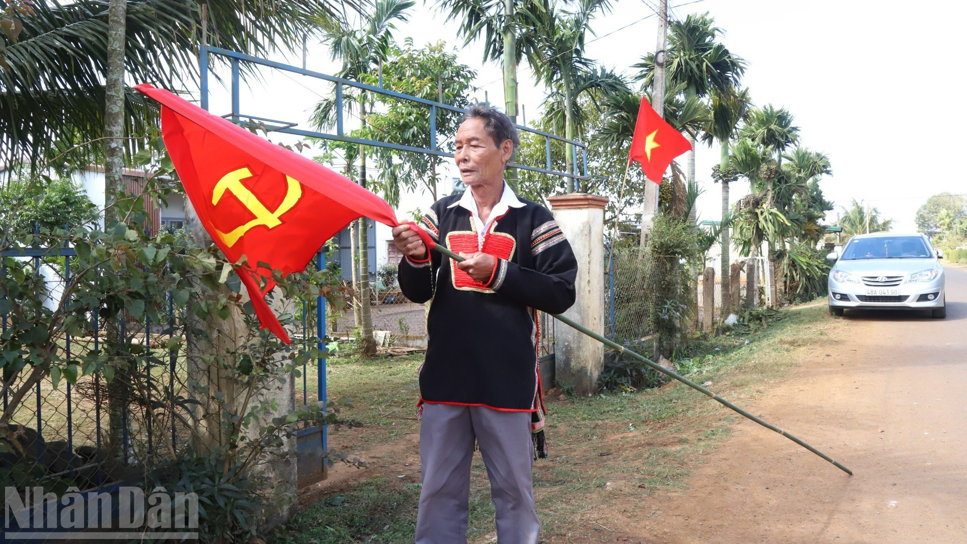 El anciano Y We Tla, de la aldea Kram A2, cuelga la bandera del Partido.