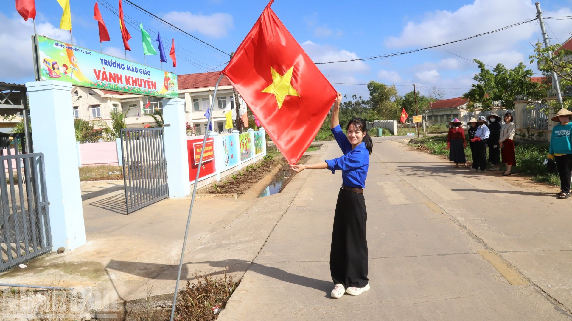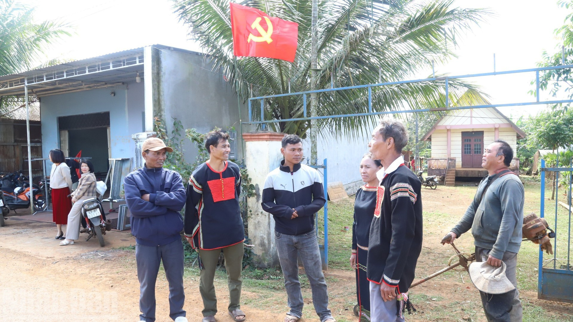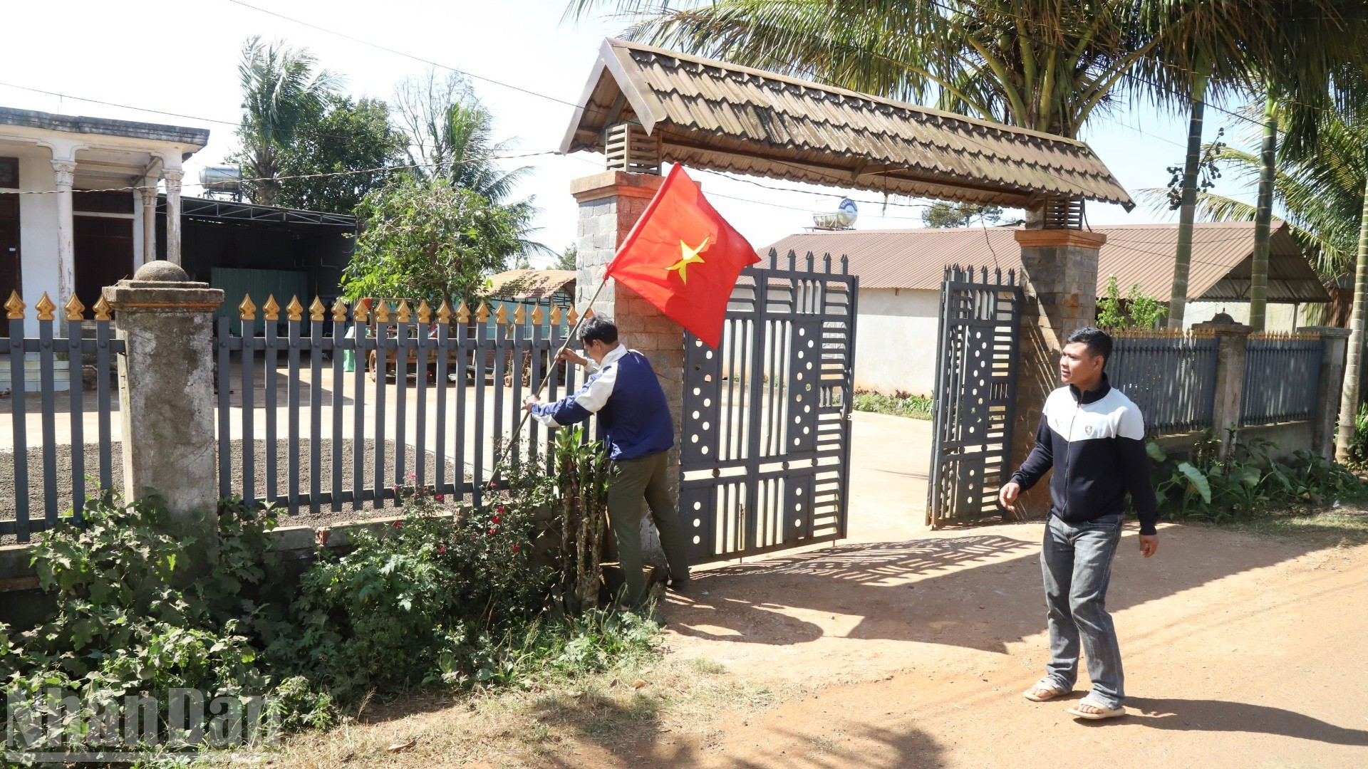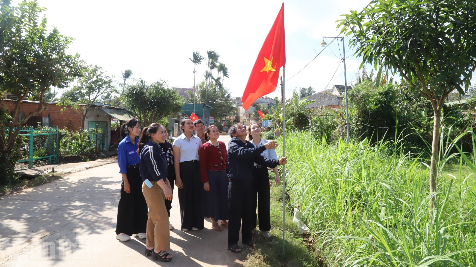 Los habitantes de la aldea Kram A2, barrio Cu Bao, izan la bandera nacional.