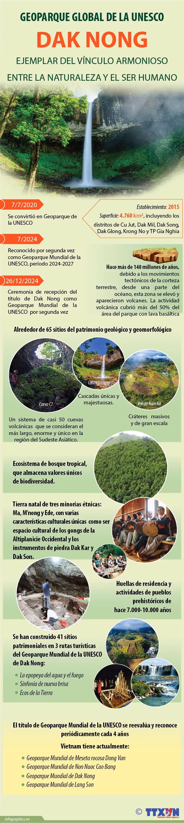 El Geoparque de Dak Nong recibió recientemente el reconocimiento de la Unesco por segunda vez. El sitio conserva valores típicos de la biodiversidad y muchas características únicas sobre la cultura, la geología y la naturaleza, así como rastros de actividades prehistóricas. Se convirtió en Geoparque Global de la Unesco por primera vez en julio de 2020.