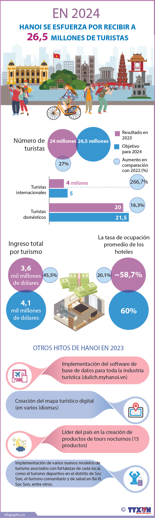 En 2023, el número de turistas en Hanói totalizó 24 millones de personas, un aumento anual del 27 por ciento. La capital de Vietnam se fija el objetivo de recibir 26,5 millones de visitantes en 2024.
