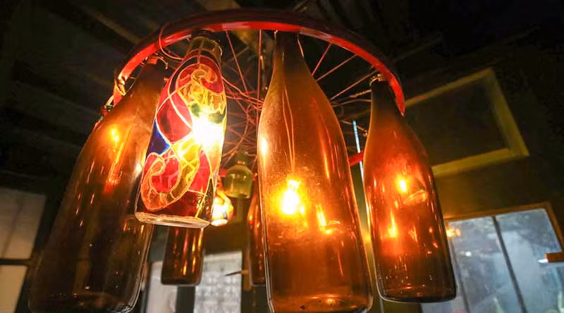 Una hermosa lámpara de araña diseñada y montada a partir de viejas botellas de vidrio.