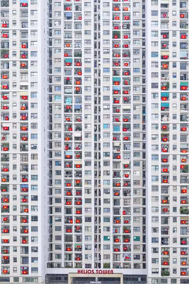 'We Are In It Together', del fotógrafo indio Prabu Mohan, mejor fotografía en la categoría Mundo encerrado. La foto, tomada en Hanói, muestra la unanimidad de los vietnamitas en un edificio de viviendas en la capital izando banderas nacionales para animar a quienes luchan en la primera línea contra la pandemia del Covid-19.