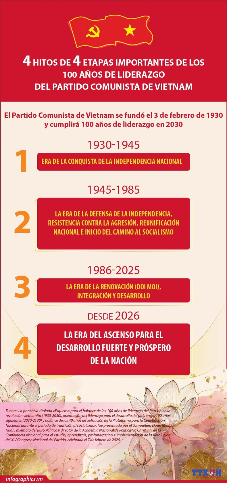 El proceso de 100 años se divide en cuatro hitos, correspondientes a cuatro eras, vinculadas a hitos decisivos del país: (i) La era de la conquista de la independencia nacional (1930-1945); (ii) La era de la defensa de la independencia, resistencia contra la agresión, reunificación nacional e inicio del camino al socialismo (1945-1985); (iii) La era de la Renovación (Doi Moi), integración y desarrollo (1986-2025); y (iv) La era del ascenso para el desarrollo fuerte y próspero de la nación.
