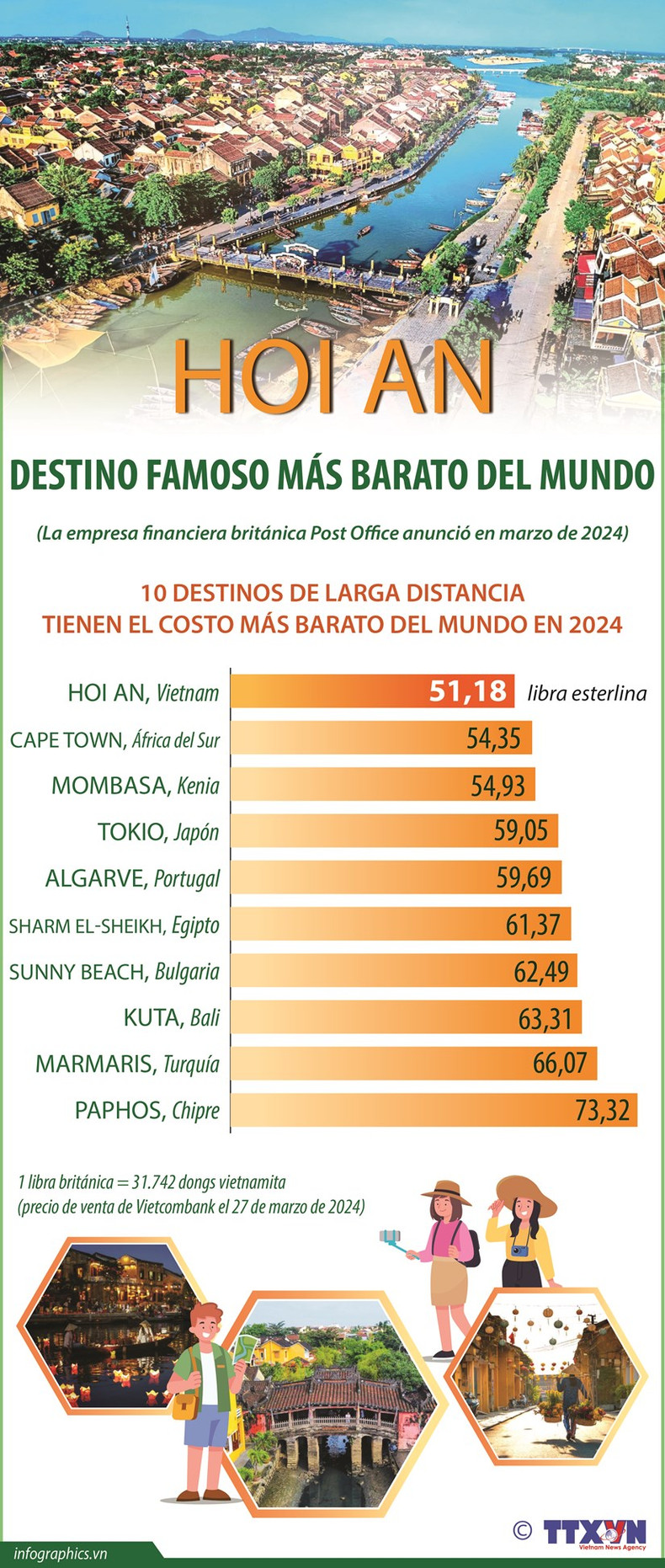 Según el Índice Global de Costos de Vacaciones 2024 recién anunciado por la Compañía financiera del Reino Unido, Post Office, Hoi An es el destino de larga distancia más barato del mundo en 2024 con un gasto promedio por huésped de unas 51,18 libras.