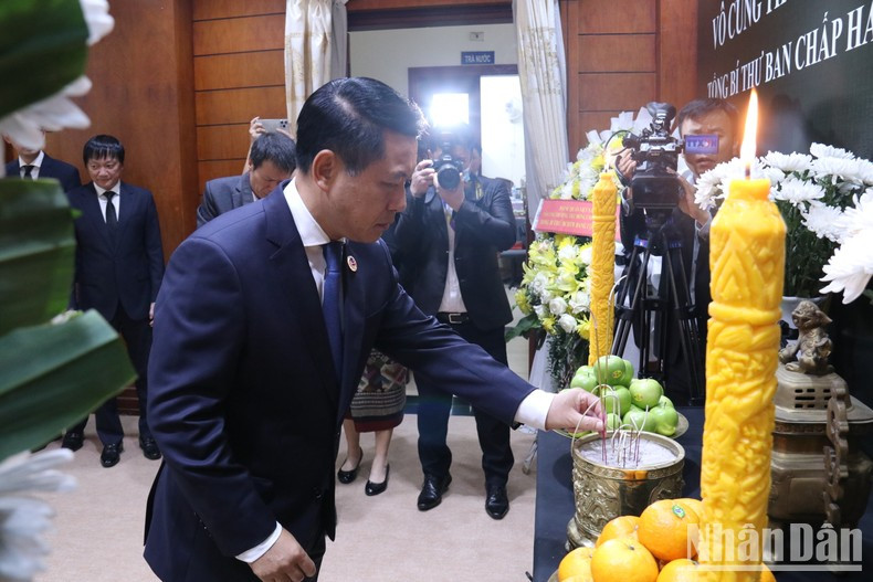 | La delegación del Ministerio de Asuntos Exteriores de Laos, encabezada por el miembro del Buró Político, vicepremier y el ministro de Asuntos Exteriores de Laos, Saleumxay Kommasith, rinde homenaje al máximo líder partidista de Vietnam, Nguyen Phu Trong. |