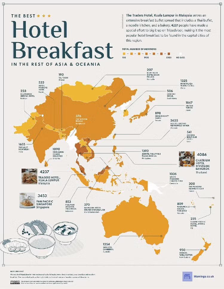 Traders Hotel en Kuala Lumpur (Malasia) lidera el listado en Asia-Pacífico, seguido por Chatrium Hotel Riverside en Bangkok (Tailandia) y Pan Pacific en Singapur.