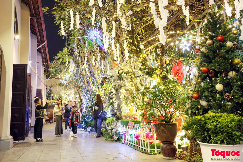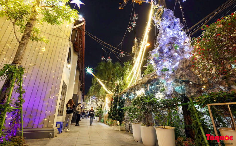 | Ubicada en la calle Nguyen Luong Bang, en el distrito de Dong Da, la parroquia de Thai Ha está decorada con luces eléctricas y flores. |