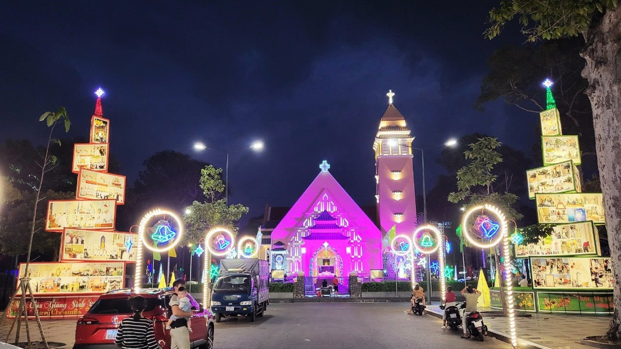 | La iglesia de Song Vinh por la noche. Abre sus puertas a los fieles desde diciembre de 2022. |