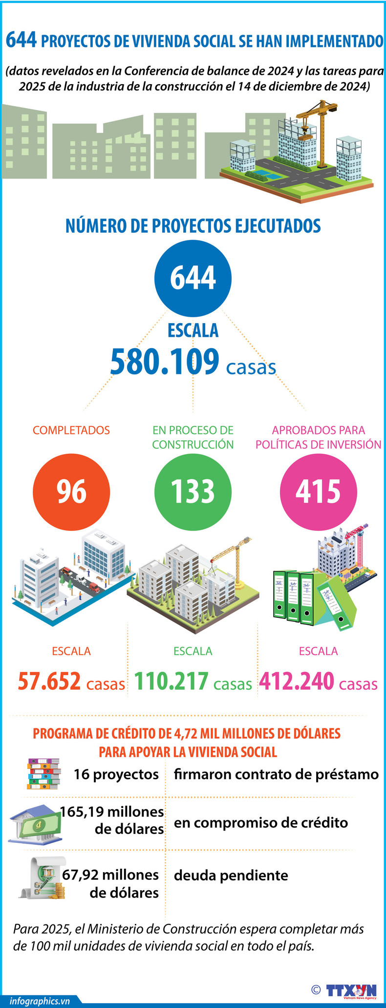 Hasta diciembre de 2024, en todo el país se han implementado 644 proyectos de vivienda social con un total de 580 mil 109 unidades, de los cuales 96 proyectos se han completado, 133 están en fase de inicio y 415 han recibido aprobación para la inversión.