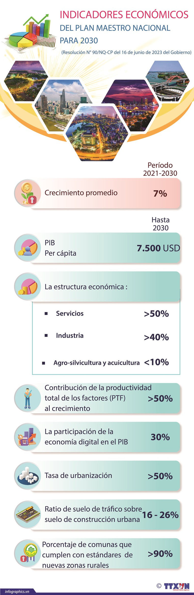 Bajo el Plan Maestro Nacional para 2021-2030 con una visión para 2050, Vietnam se esfuerza por alcanzar una tasa de crecimiento anual del PIB del 7 por ciento durante el período 2021-2030. Para 2030, se espera que el PIB per cápita sea unos siete mil 500 dólares.