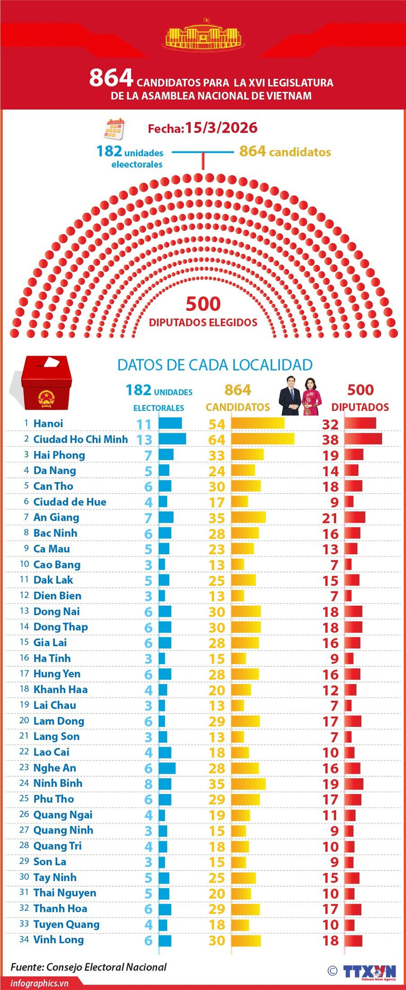 El presidente de la Asamblea Nacional de Vietnam y titular del Consejo Electoral Nacional, Tran Thanh Man, firmó y promulgó la Resolución 151/NQ-HDBCQG fechada el 14 de febrero de 2026, que anuncia la lista oficial de candidatos al cargo de diputado de la Asamblea Nacional de la XVI legislatura por cada circunscripción electoral en todo el país.