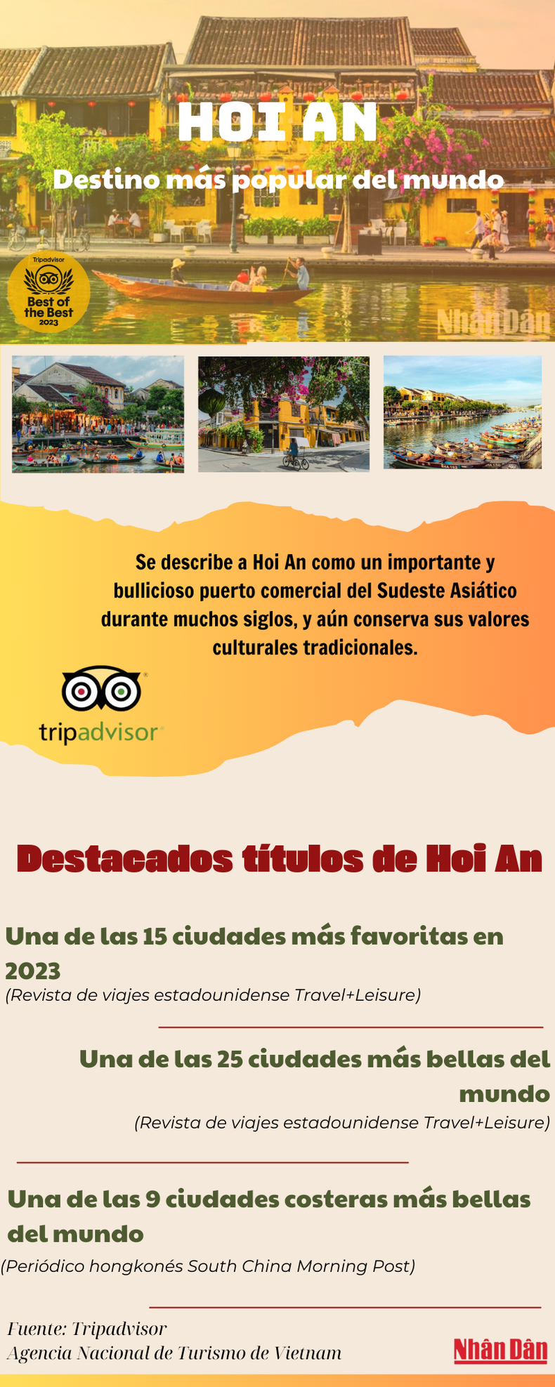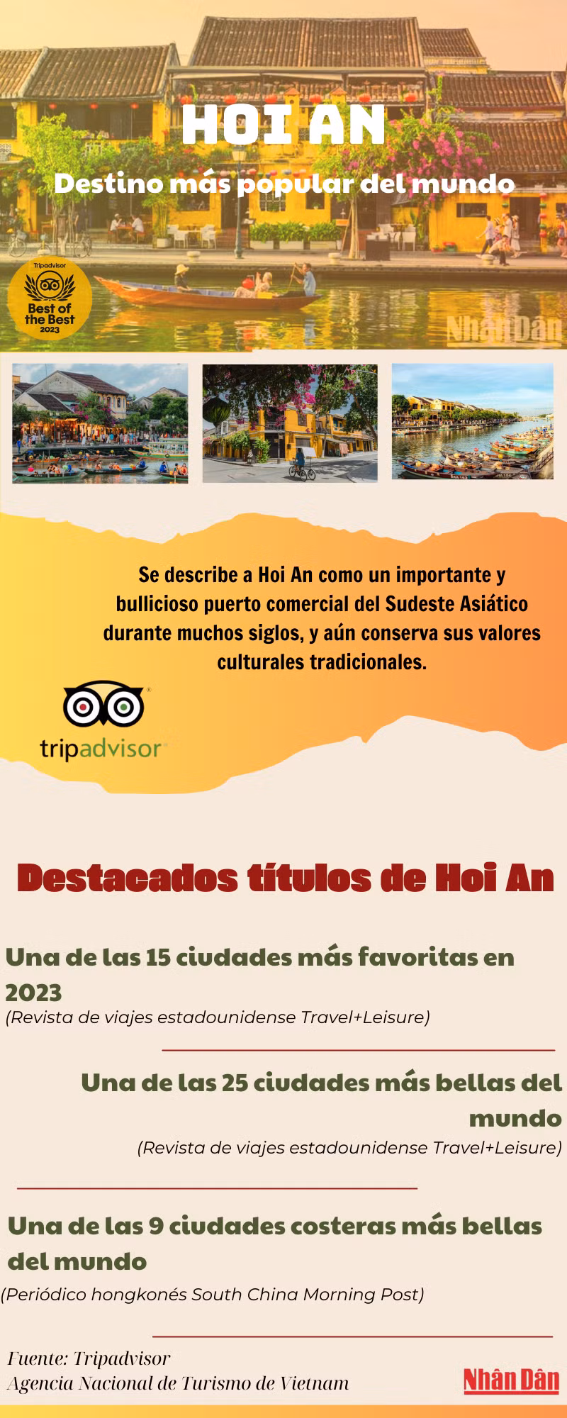 La ciudad de Hoi An, en la central provincia vietnamita de Quang Nam, ocupa el segundo puesto en el ranking de los 25 destinos más populares del mundo en 2023 , según los Premios Travelers’ Choice Best of the Best Destinations , de la prestigiosa plataforma de turismo global TripAdvisor.