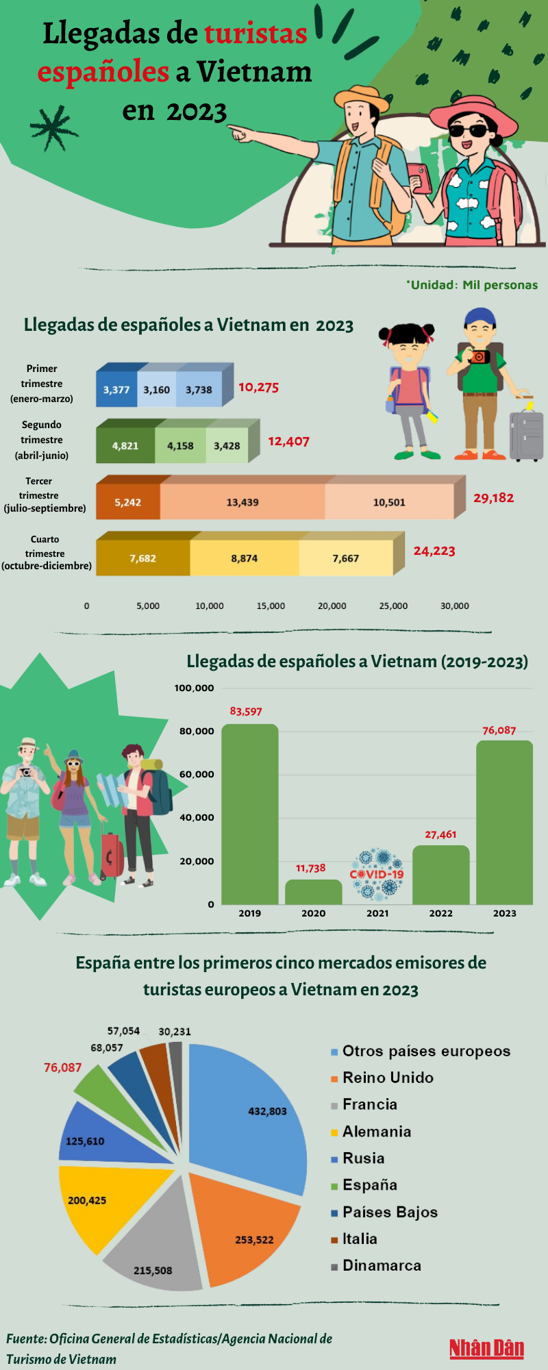 Los turistas españoles llegados a Vietnam en 2023 totalizaron 76 mil 087, un aumento de 2,8 veces respecto al 2022.
