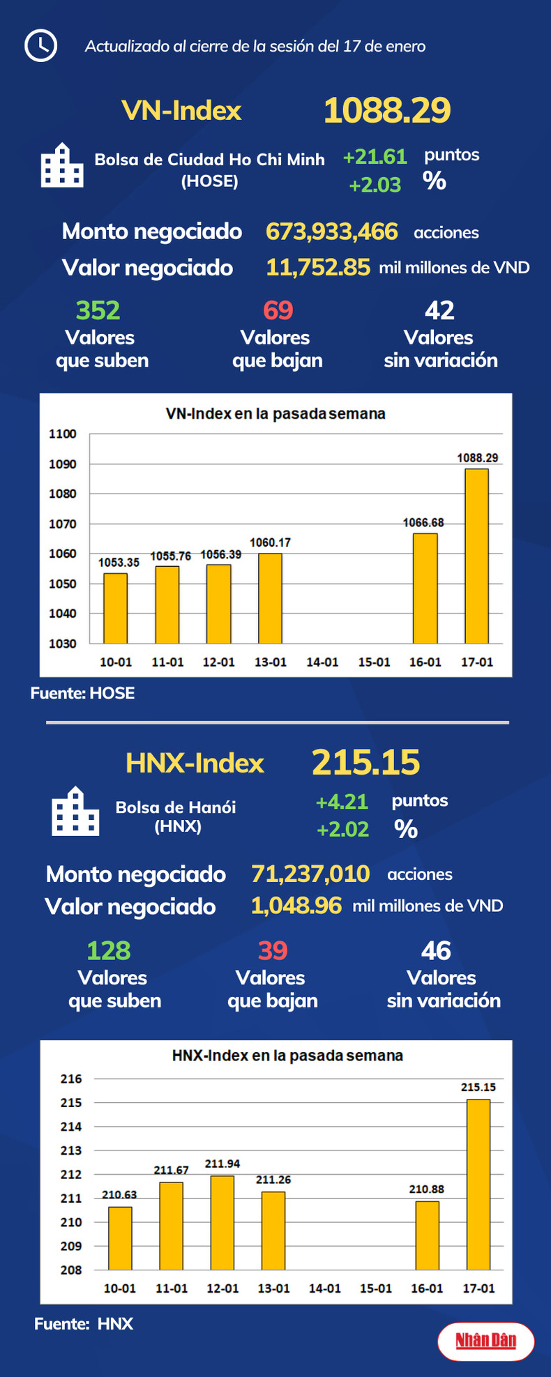 Al cierre de la sesión del 17 de enero de 2023, la Bolsa de Ciudad Ho Chi Minh, en Vietnam, registró 352 valores que subieron, 69 que bajaron y 42 sin variación, mientras en Hanói las cifras marcaron 128, 39 y 46.