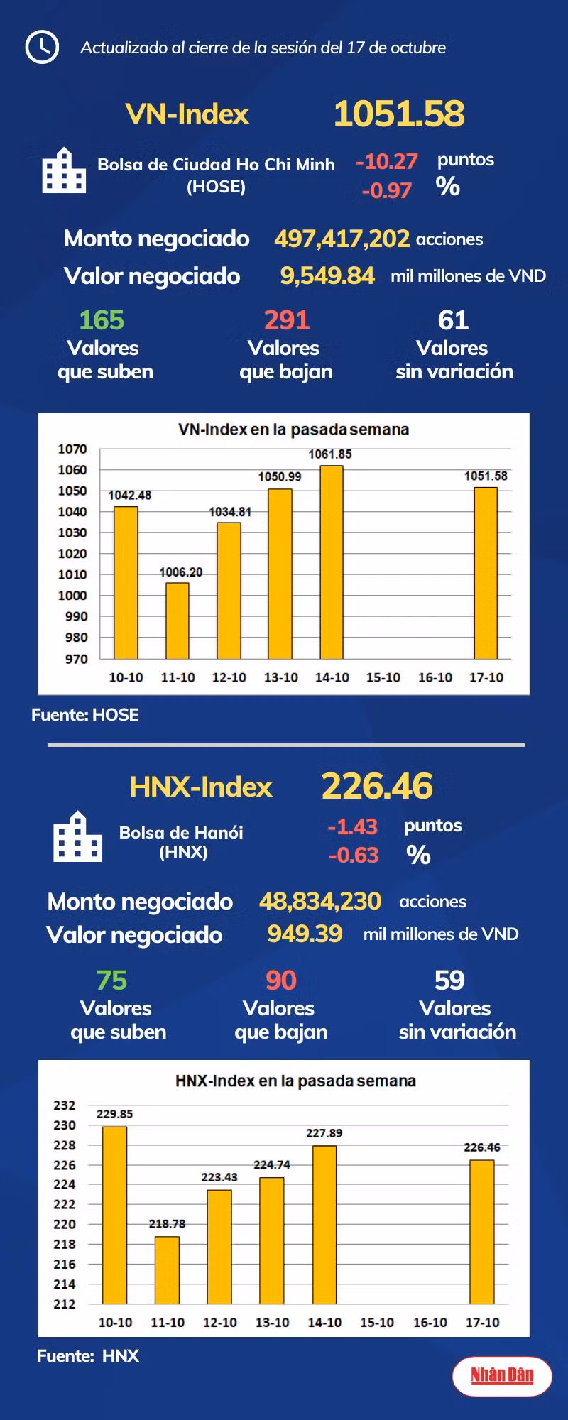 Al cierre de la sesión del 17 de octubre de 2022, la Bolsa de Ciudad Ho Chi Minh, en Vietnam, registró 165 valores que subieron, 291 que bajaron y 61 sin variación, mientras en Hanói las cifras marcaron 75, 90 y 59.