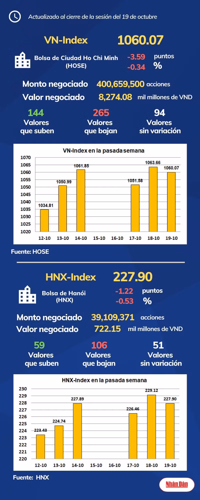 Al cierre de la sesión del 19 de octubre de 2022, la Bolsa de Ciudad Ho Chi Minh, en Vietnam, registró 144 valores que subieron, 265 que bajaron y 94 sin variación, mientras en Hanói las cifras marcaron 59, 106 y 51.