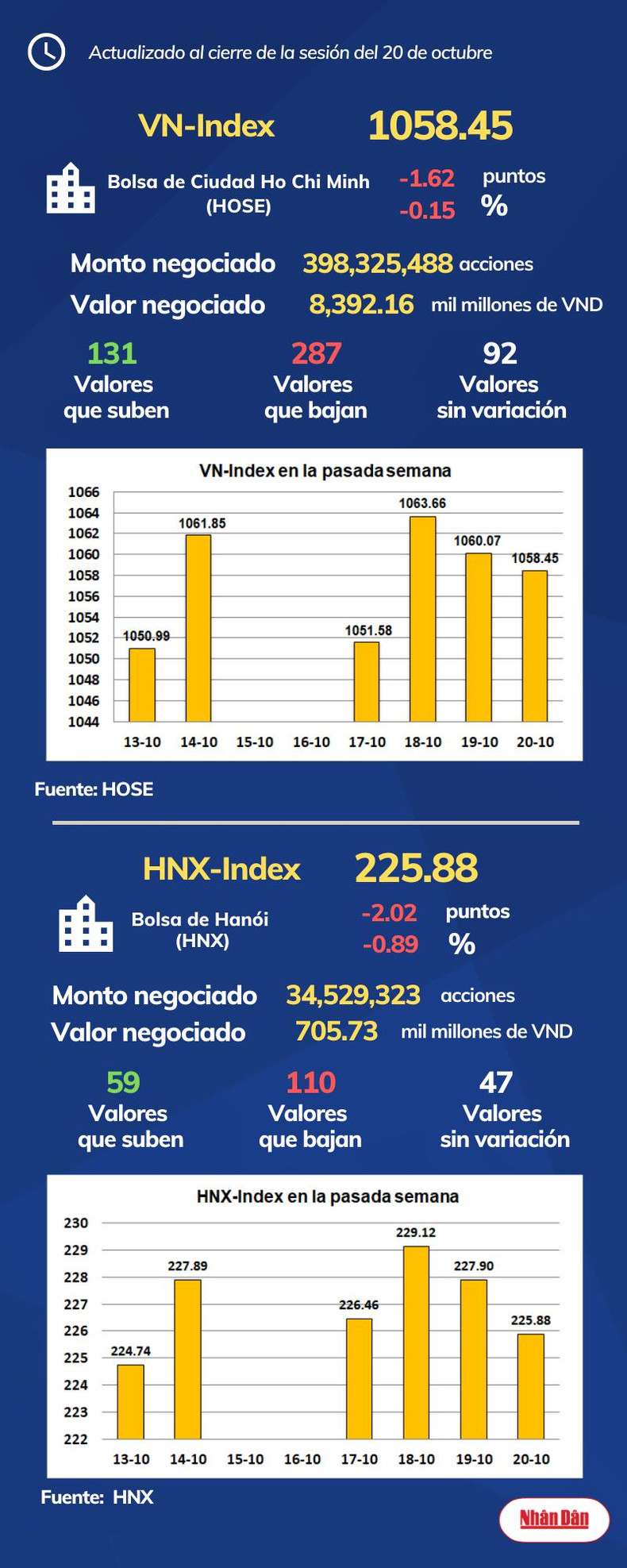 Al cierre de la sesión del 20 de octubre de 2022, la Bolsa de Ciudad Ho Chi Minh, en Vietnam, registró 131 valores que subieron, 287 que bajaron y 92 sin variación, mientras en Hanói las cifras marcaron 59, 110 y 47.