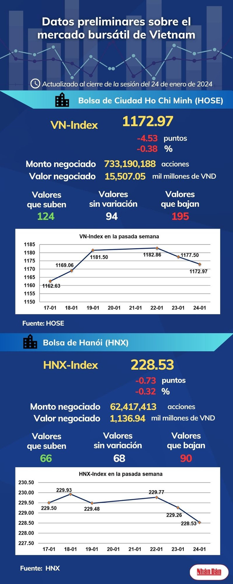 Al cierre de la sesión del 24 de enero de 2024, la Bolsa de Ciudad Ho Chi Minh, en Vietnam, registró 124 valores que subieron, 195 que bajaron y 94 sin variación, mientras en Hanói las cifras marcaron 66, 90 y 68.