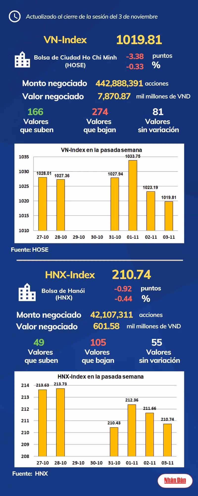 Al cierre de la sesión del 3 de noviembre de 2022, la Bolsa de Ciudad Ho Chi Minh, en Vietnam, registró 166 valores que subieron, 274 que bajaron y 81 sin variación, mientras en Hanói las cifras marcaron 49, 105 y 55.