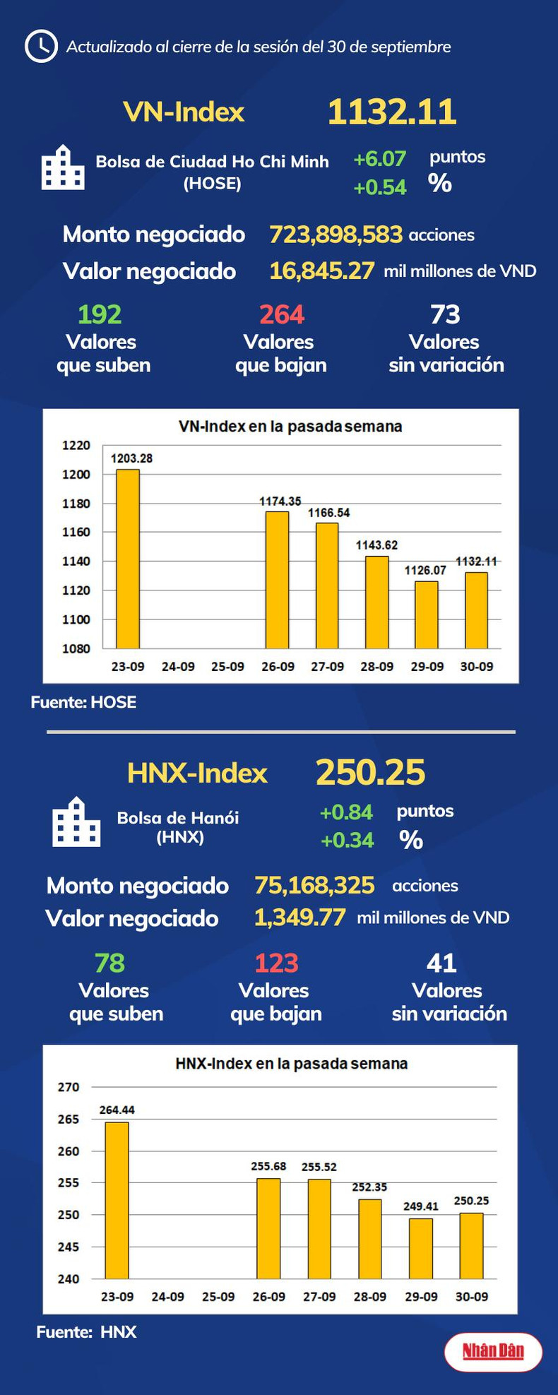 Al cierre de la sesión del 30 de septiembre de 2022, la Bolsa de Ciudad Ho Chi Minh, en Vietnam, registró 192 valores que subieron, 264 que bajaron y 73 sin variación, mientras en Hanói las cifras marcaron 78, 123 y 41.