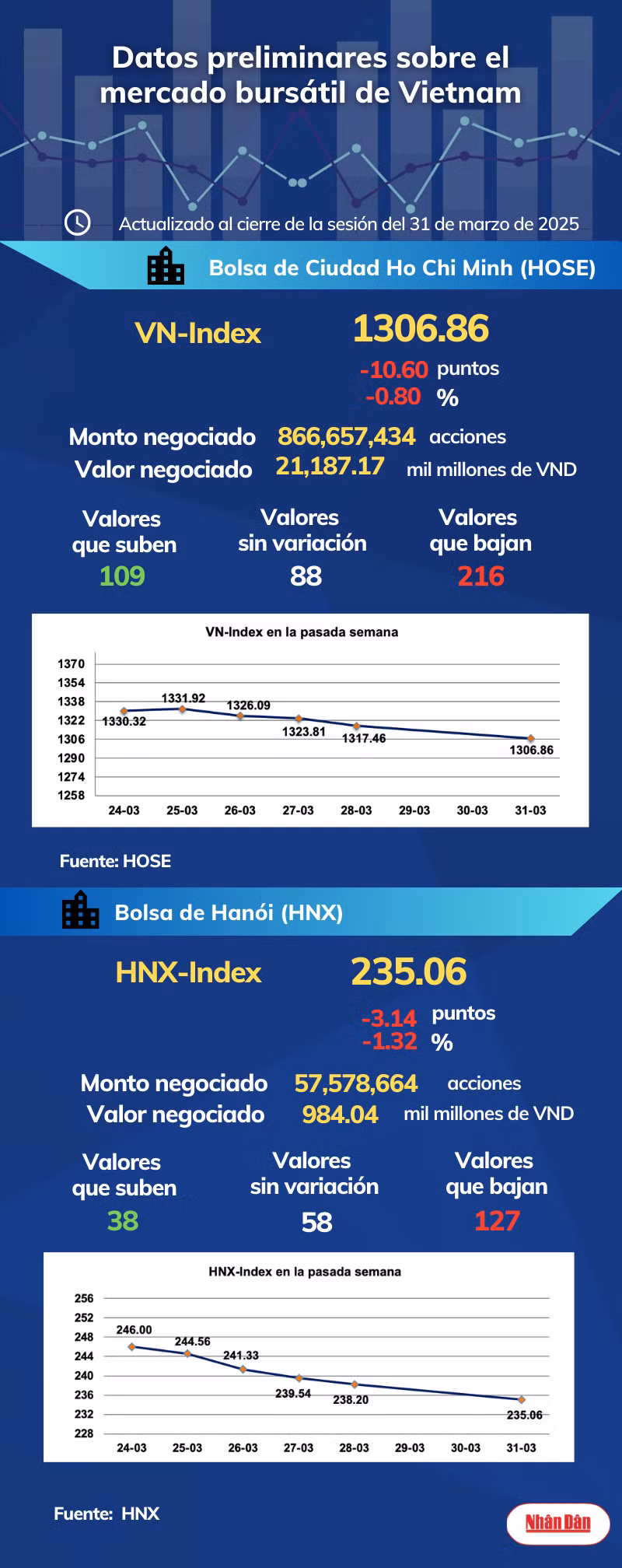Al cierre de la sesión del 31 de marzo de 2025, la Bolsa de Ciudad Ho Chi Minh, en Vietnam, registró 109 valores que subieron, 216 que bajaron y 88 sin variación, mientras en Hanói las cifras marcaron 38, 127 y 58.