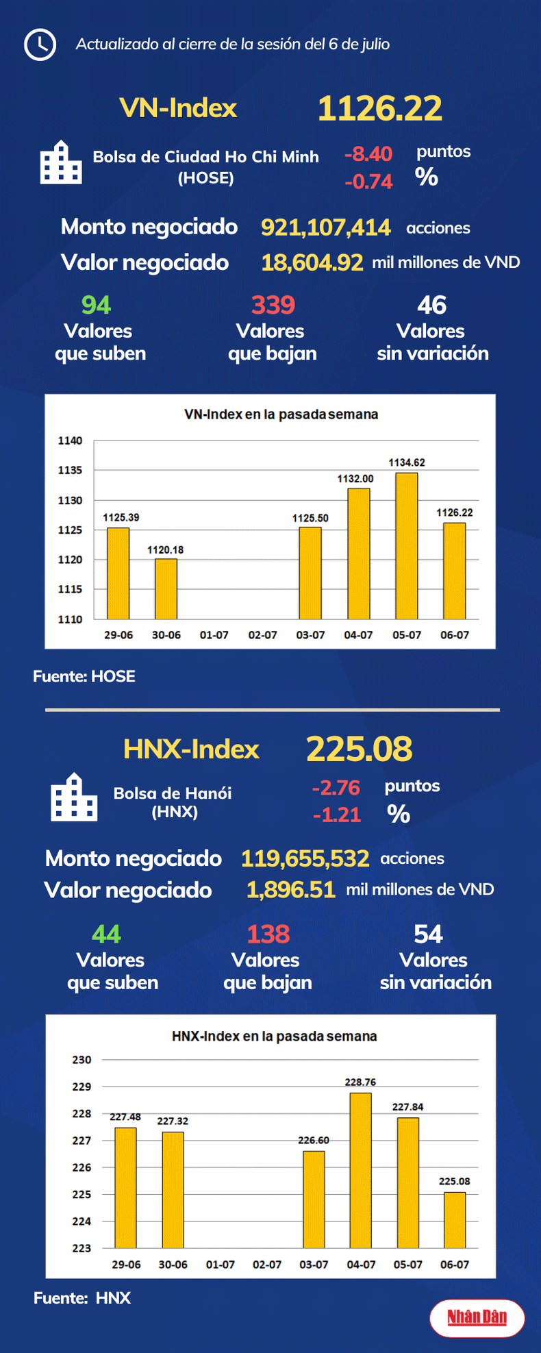Al cierre de la sesión del 6 de julio de 2023, la Bolsa de Ciudad Ho Chi Minh, en Vietnam, registró 94 valores que subieron, 339 que bajaron y 46 sin variación, mientras en Hanói las cifras marcaron 44, 138 y 54.