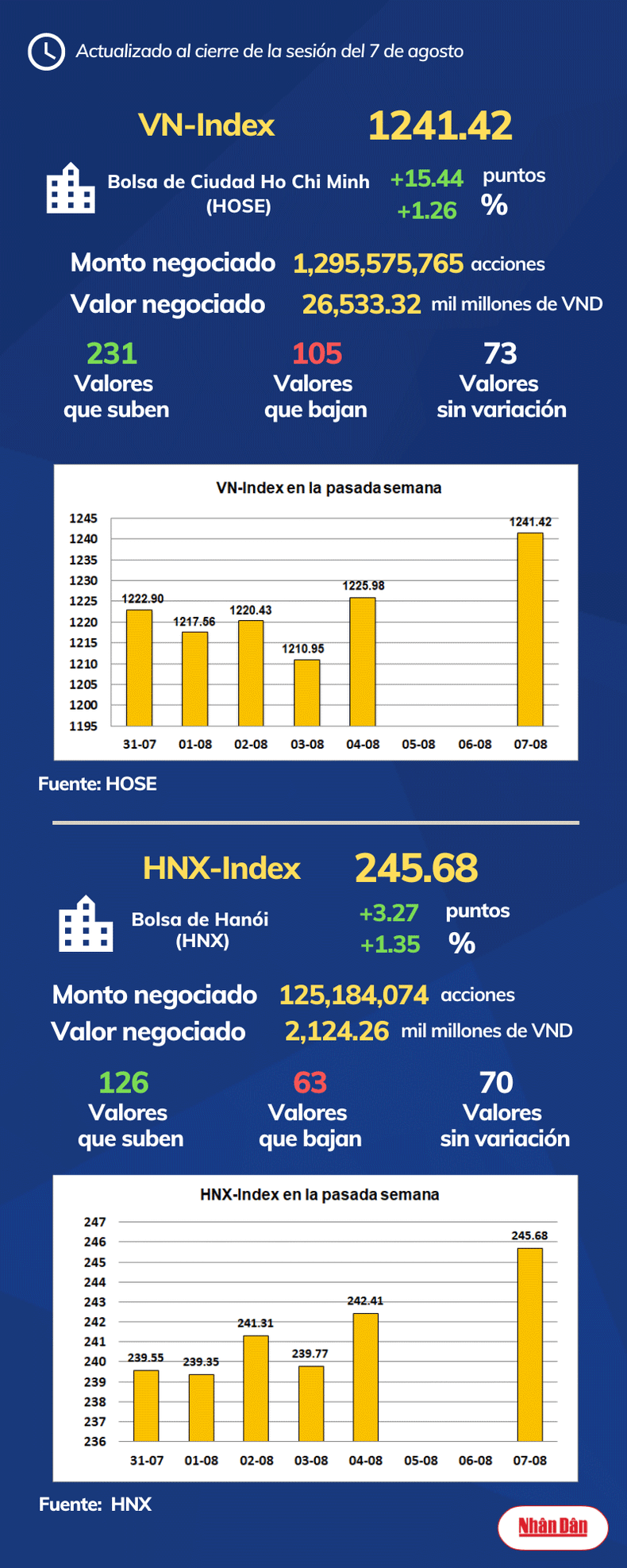 Al cierre de la sesión del 7 de agosto de 2023, la Bolsa de Ciudad Ho Chi Minh, en Vietnam, registró 231 valores que subieron, 105 que bajaron y 73 sin variación, mientras en Hanói las cifras marcaron 126, 63 y 70.