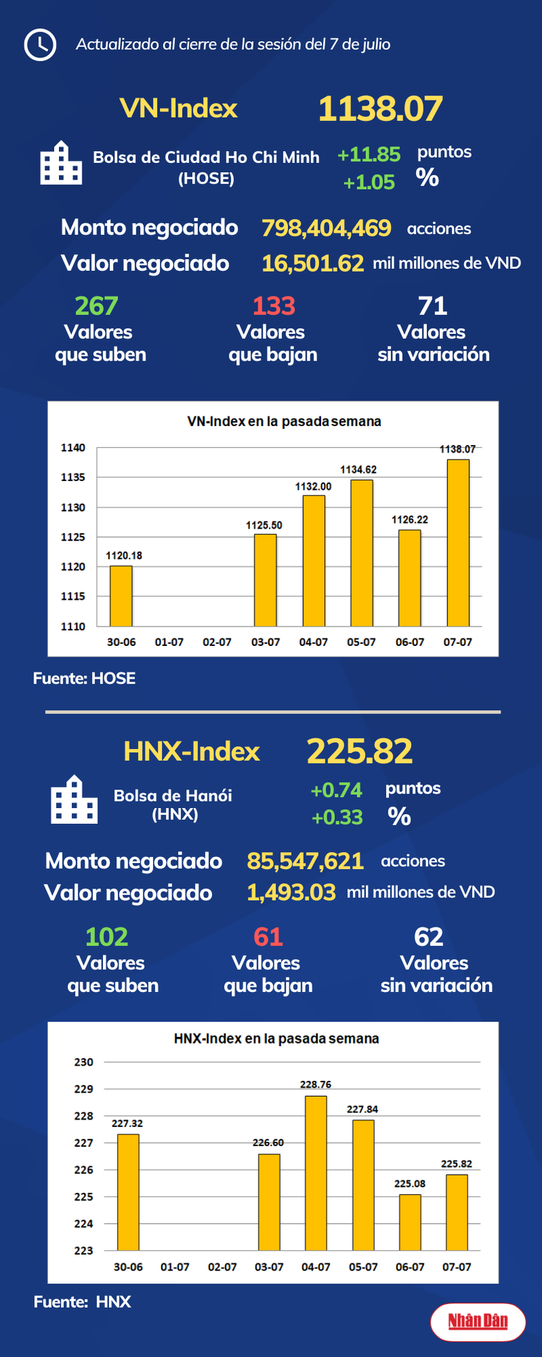 Al cierre de la sesión del 7 de julio de 2023, la Bolsa de Ciudad Ho Chi Minh, en Vietnam, registró 267 valores que subieron, 133 que bajaron y 71 sin variación, mientras en Hanói las cifras marcaron 102, 61 y 62.
