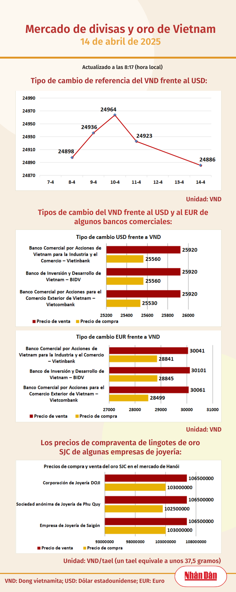 miércoles, diciembre 10, 2025 08:45 Infografía: Mercado de divisas y oro de Vietnam - 10 de diciembre de 2025 El dólar estadounidense se cotiza hoy en 25155 dongs vietnamitas (VND) (Referencia del Banco Estatal de Vietnam).