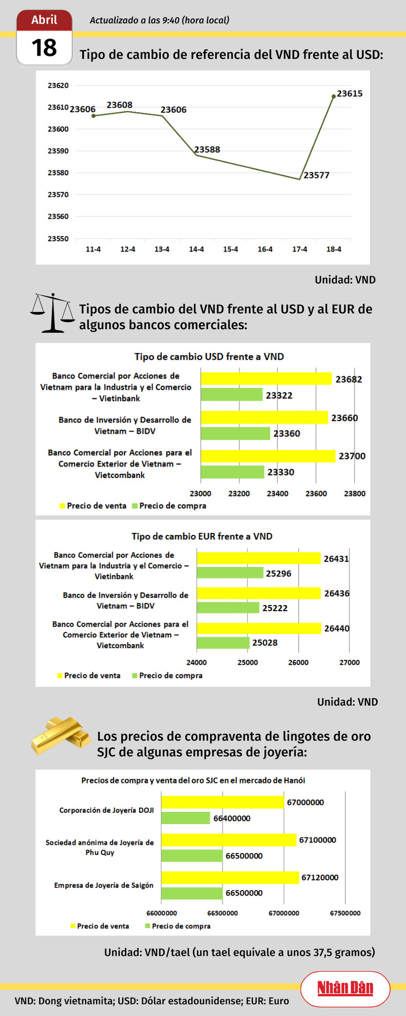 lunes, noviembre 10, 2025 08:48 Infografía: Mercado de divisas y oro de Vietnam - 10 de noviembre de 2025 El dólar estadounidense se cotiza hoy en 25106 dongs vietnamitas (VND) (Referencia del Banco Estatal de Vietnam)